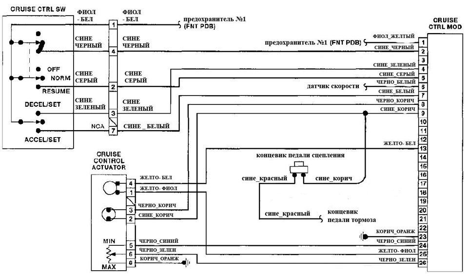 Проводки под круиз у меня не было совсем! Хорошо что мне с кондерной проводкой отдали всю подкапотную проводку и с нее я смог выбрать провода нужной длины и цвета, штекеры и сплести косу руководствуясь вот такой схемой для удобства переведенной на русский