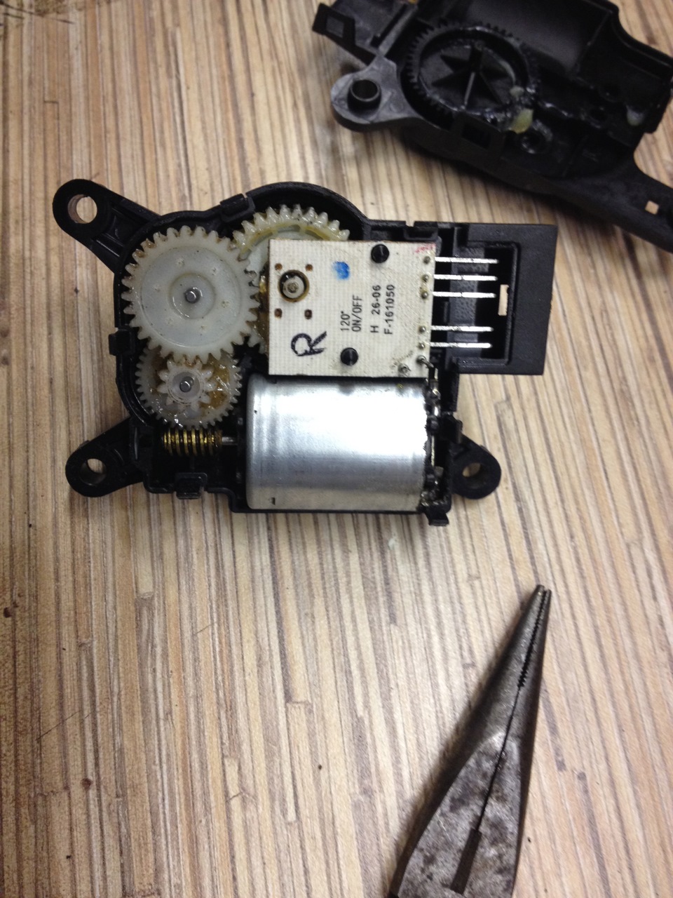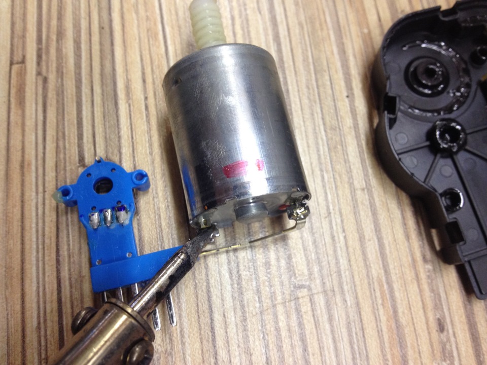 Разбираем приоровский привод, выпаиваем мотор (кстати его номер есть на фото, возможно Вы найдете его в продаже отдельно), извлекаем, снимаем со штока пластиковую шестеренку.