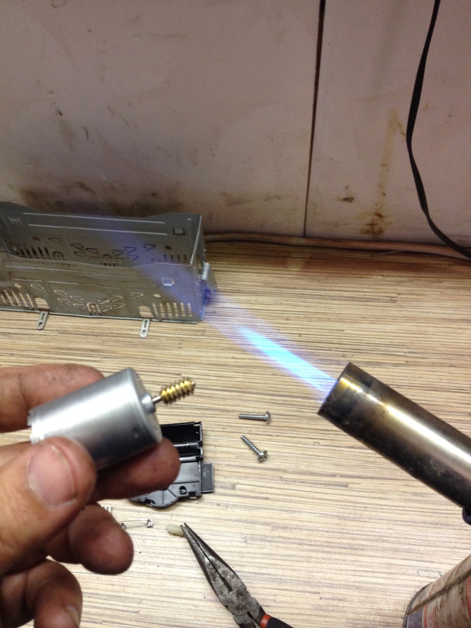 Немного нагреваем шестеренку из желтого металла и сажаем ее на ось рабочего мотора, затем немного подпиливая корпус ремонтируемого привода вставляем мотор на место, затем впаиваем мотор и тестируем привод на рабочей машине (если полярность правильная и шестеренка установлена правильно, а не задом наперед, привод будет работать нормально, если же Вы что то намудрили включенный привод будет непрерывно дергаться).