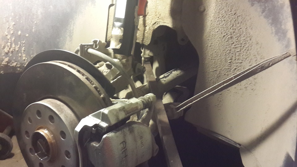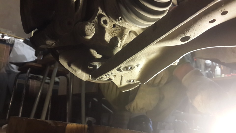 — Откручиваем болт крепления стойки за шляпку болта :)) (с ним есть некое неудобство, т.к хода почти нет, пришлось лезть под машину), предварительно под балку подставив опору, чтобы она резко не упала, после откручивания второй стойки, убираем опору, пружины почти вываливаются сами :) Обратно для удобства, устанавливал уже с помощью третьего домкрата, поднимал подрамник с новыми пружинами