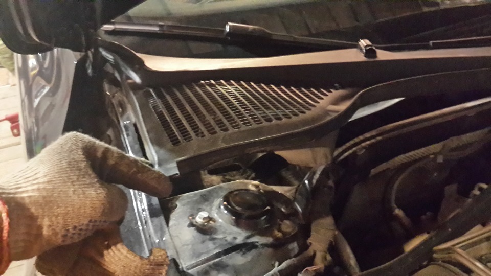 1. Начинаем с того, что разбираем пластик под капотом, для того чтобы открутить верхнее крепление стойки, конструктив пластика таков, что он состоит из двух частей, ту часть, что со стороны пассажира, просто вытягиваем вбок и на себя. А вот чтобы снять вторую часть нужно, снимать дворники, достаточно снять один водительский(я это понял, но увы поздно :(( и уже можно будет свободно отогнуть пластик. По идее для съема дворников, нужно использовать маленький спец.съемник(фото ниже), но можно и без него, сделать чем-либо натяг и постукивать через гайку по шпильке дворника.Я допустил фатальную ошибку, и сделал натяг через маленький брусок со стороны лобового стекла, уперев его, даже не приложив толком усилий, стекло лопнуло, по началу даже не понял, что произошло, никогда не думал что лобовое стекло м.б. таким хрупким, но это факт, край стекла очень нежный.Вообщем настроение на весь вечер в ноль, хорошо есть в КАСКЕ — поменяем :)) Будем считать что словил камень на трассе :DD
