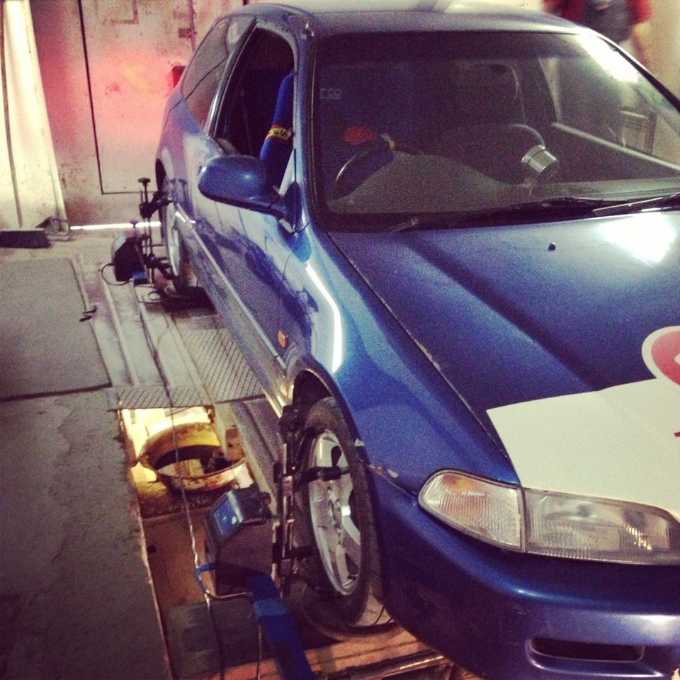 На развале возвращаем развал на Сивике к параметрам -2°20’ спереди и -1°30’ (ведь одной из особенностей на двухрычажной подвески являет то, что при занижении увеличивается и развал). И вперед на трассу. А там асфальт еще мокрый. Черт!
