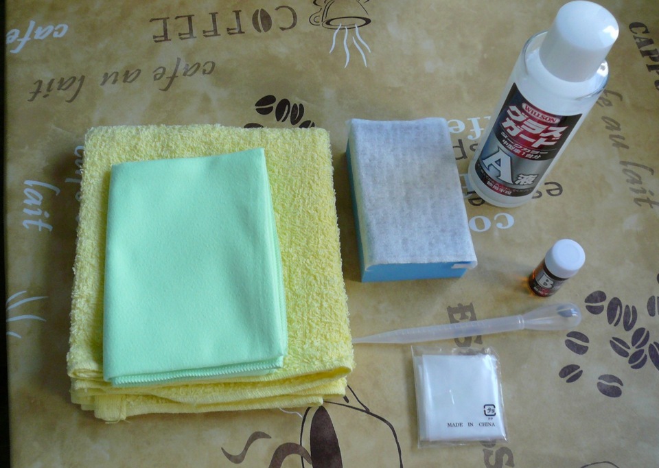 В комплект входят губка для нанесения, два полотенца для полировки, полиэтиленовая перчатка для защиты кожи рук, пипетка и полироль