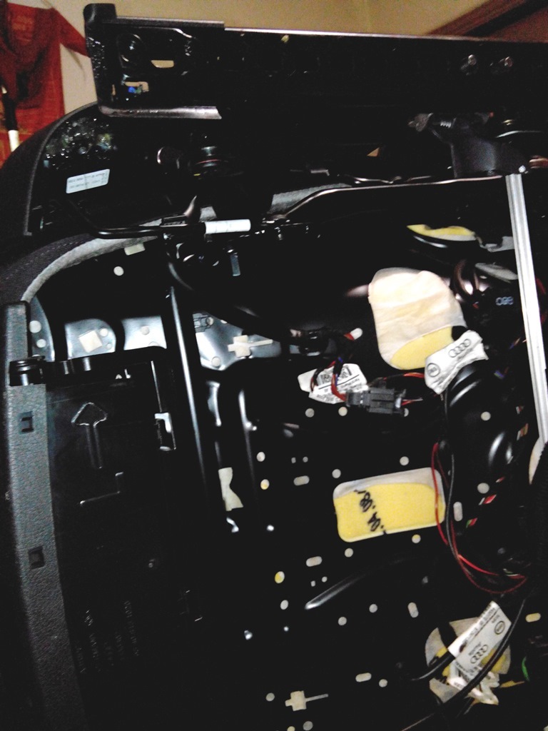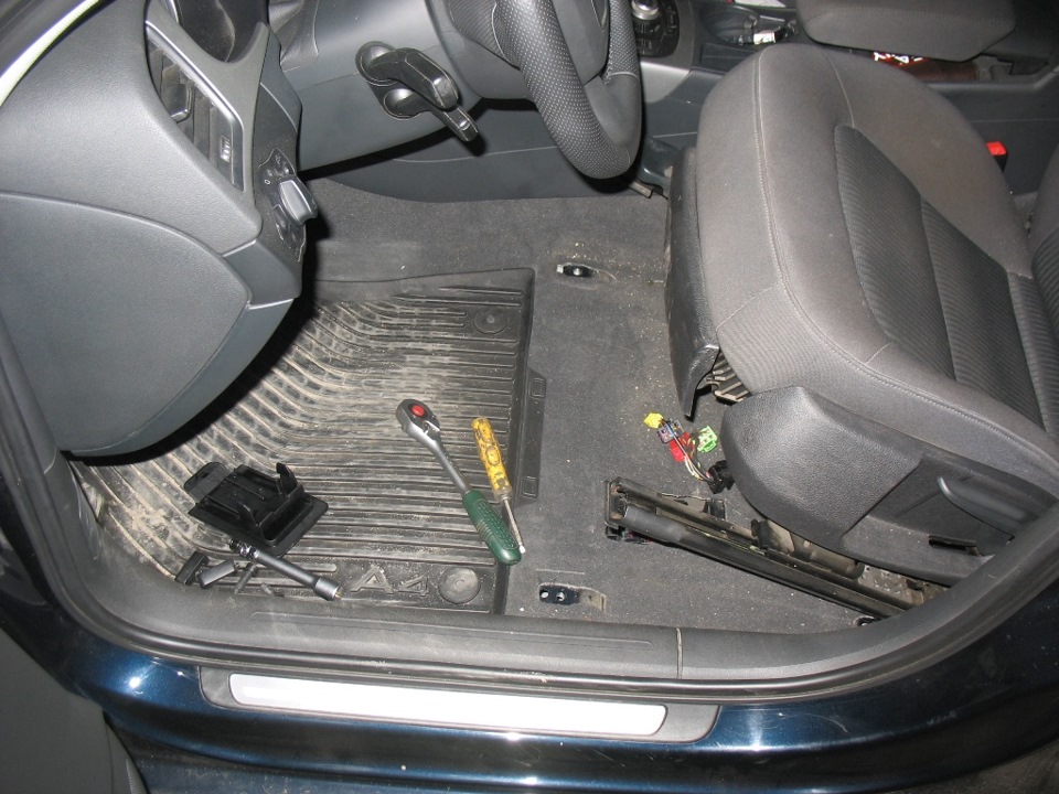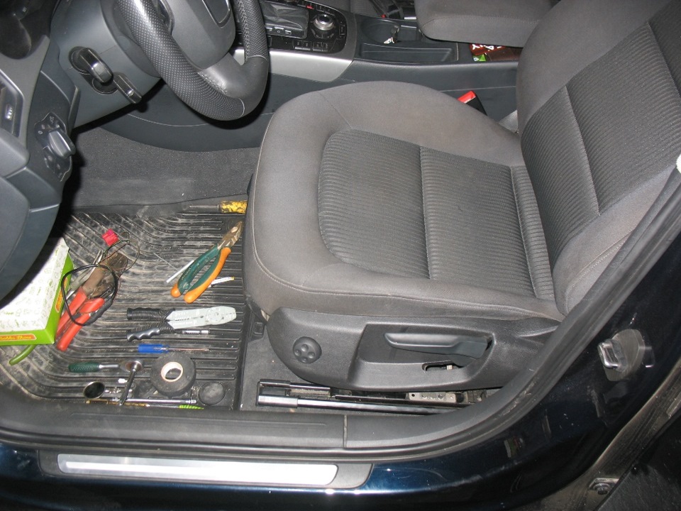 Вернемся к сиденью — клей остыл. Протягиваем штатную проводку, крепим как положено, в красный разъем сидухи вставляем "мамы" питания моторчиков.