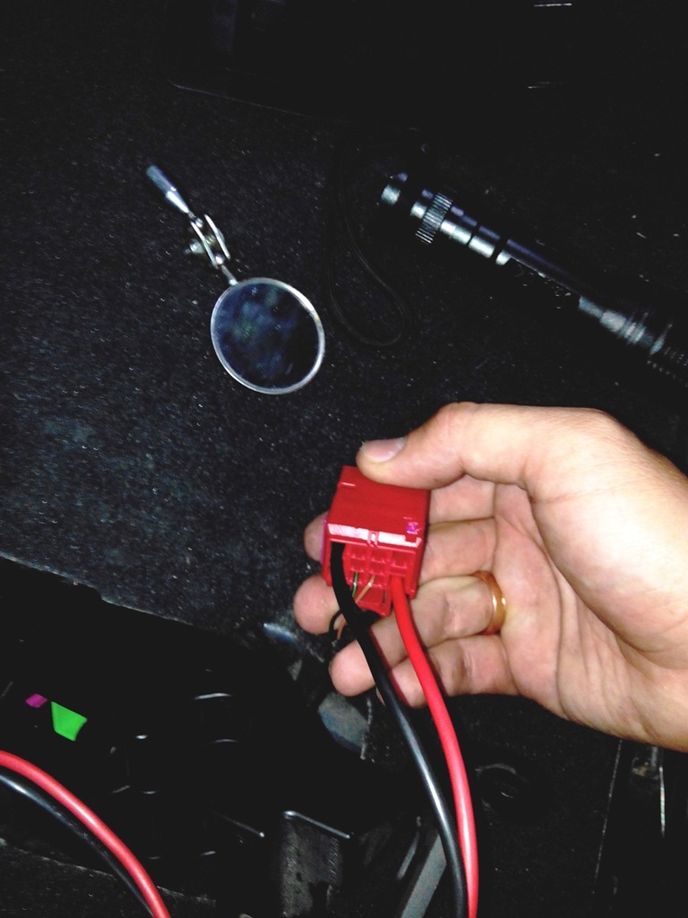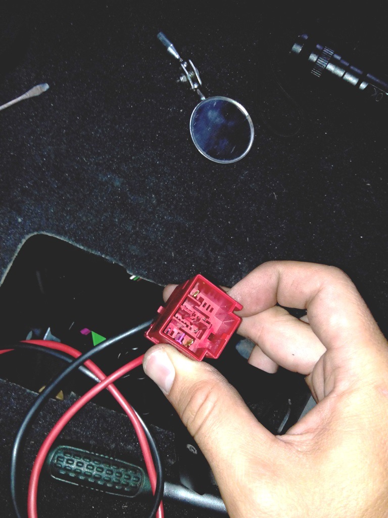 Вытаскиваем из недр разъемы, нас интересует красный. Т.к. подсветка пространства ног для задних пассажиров присутствует в авто, разъем есть, но естественно ответная часть только для подсветки, т.е. 2 тонких контатка (+/-).