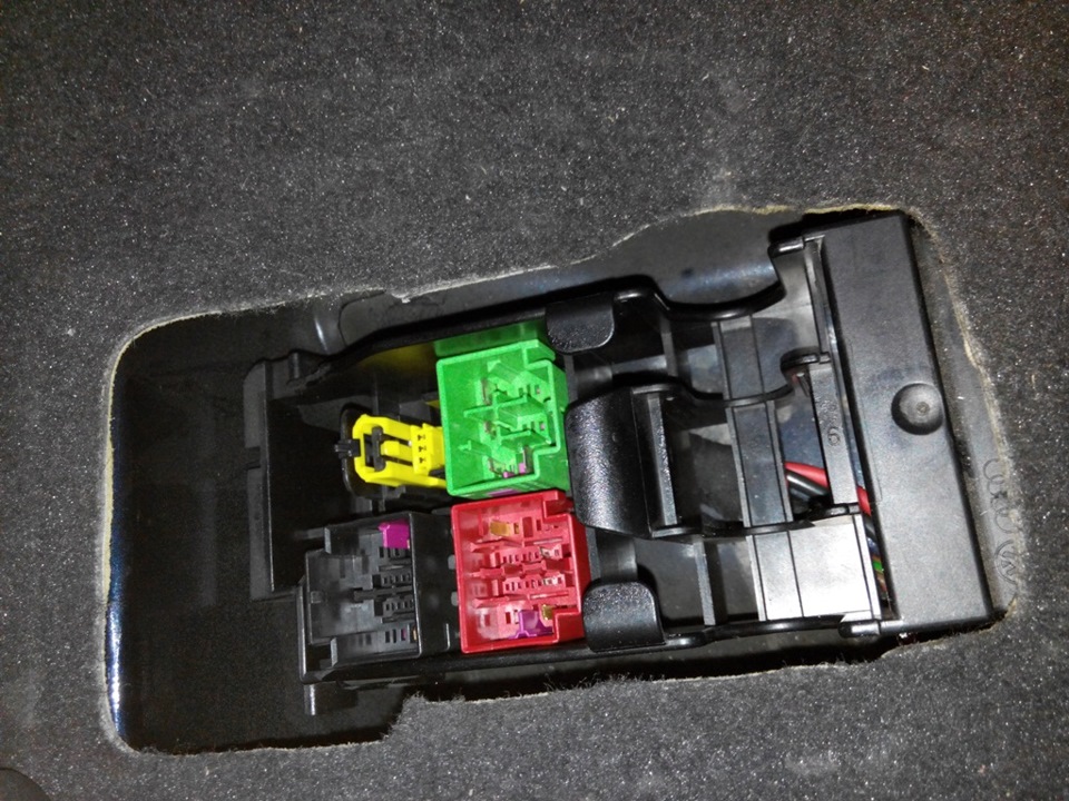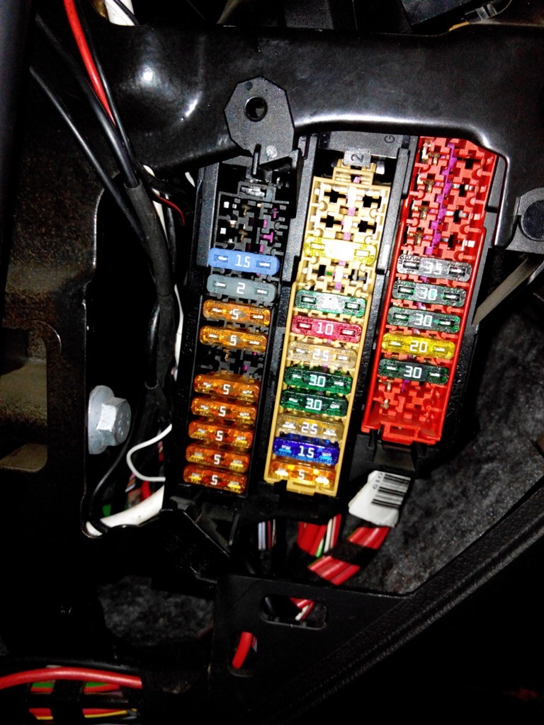 Видим 2 "не штатных" предохранителя в левой колодке — новый 15А — для нужд сиденья и ниже 2А — пару лет назад установлен — питание радар-детектора, garmin, передней камеры и монитора-накладки на зеркало заднего вида.