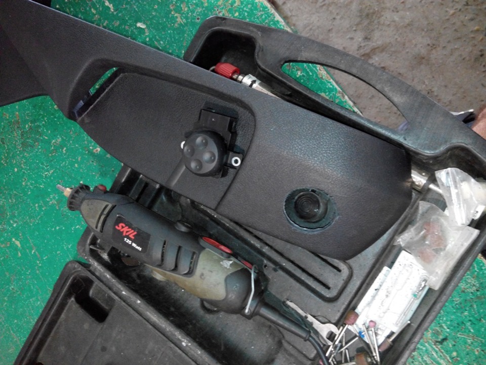 Отсоединяем накладку (которая со стороны порога). С внутренней стороны накладки размечаем будущее местоположение 4-х позиционного переключателя опоры, прибегаем к помощи "дремеля" и получаем…