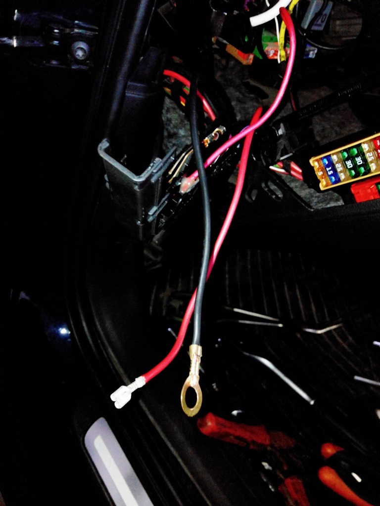 Определяем длины проводов и обжимаемся — массу крепим под подходящий "болт к кузову" (штатные места, их много где есть), плюсовой — обжимаем "мамой" (затем разъем слегка придавим с боков чтобы влез куда надо).