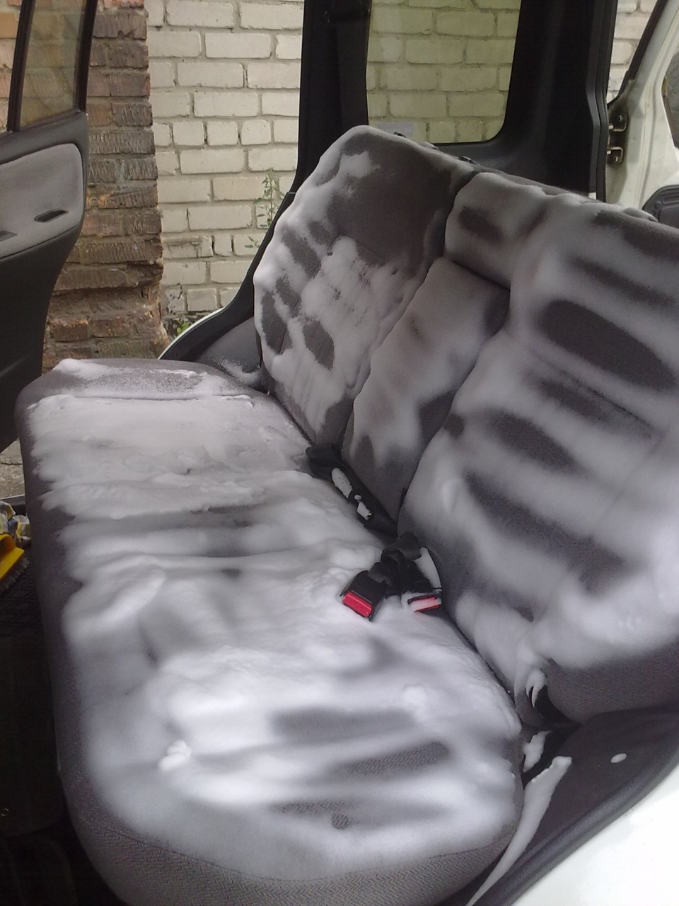водой не забудь смыь средство, ато потом пыль прилепица быстро и опять на какаху будет похож…в вообще лучше кершер и частичный разбор салона))