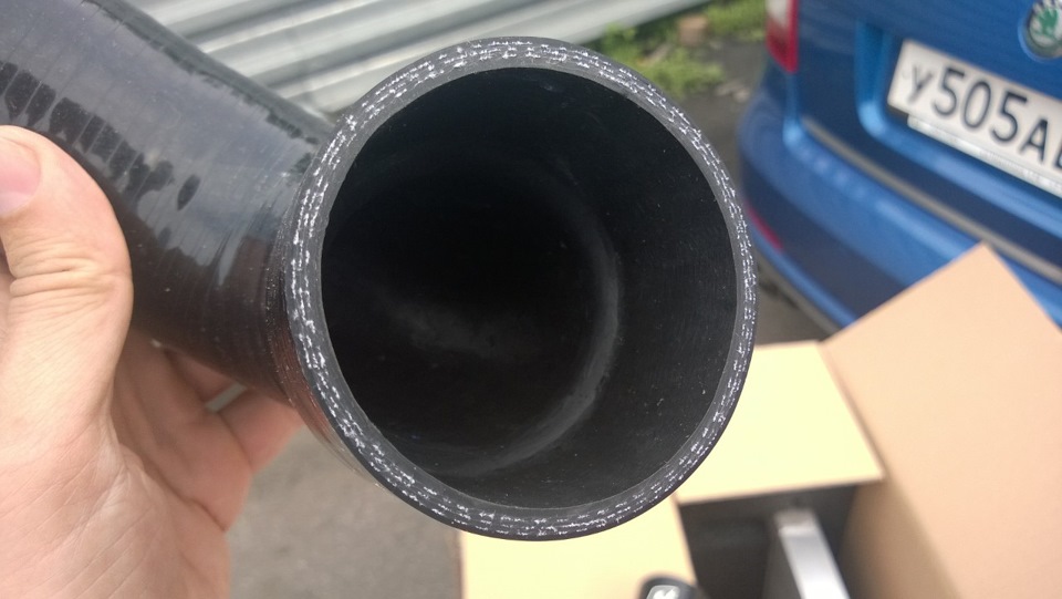 В комплекте с ним идут армированные силиконовые патрубки, со ступенькой, позволяющей воздуху идти ровным потоком. Опять же, компания APR позиционирует свои патрубки со ступенькой как уникальные, но оказывается не только у них реализовано это решение!