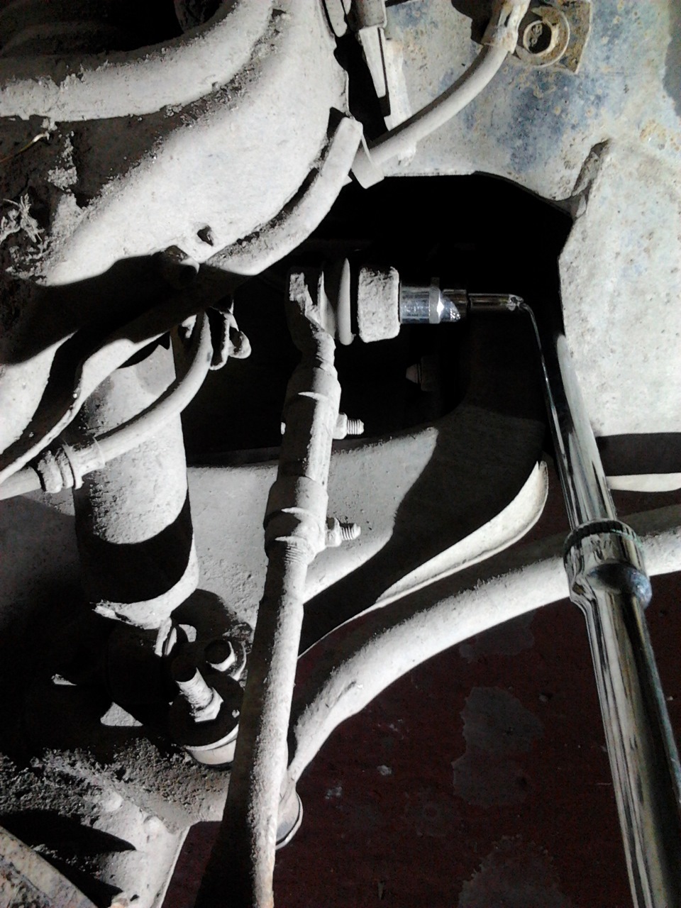 Итак, домкратим машину, снимаем колесо, берём рычаг поболе и откручиваем рулевую