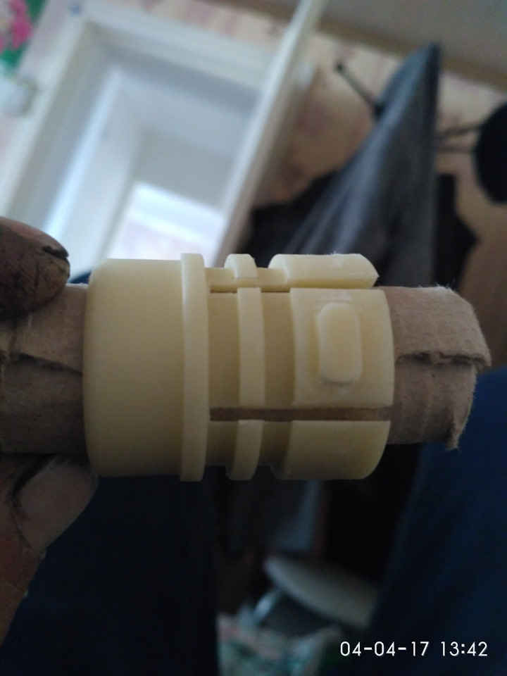 На следующий день, захватив с собой родную втулку, я поехал в организацию которая занимается продажей РТИ. Изначально я думал, что это материал Фторопласт, но подержав в руках и проведя маленькие эксперименты (такие как нажатие монеткой на материал), я уяснил что материал для изготовления нужен Капролон. Капролон обладает более лучшими характеристиками, хотя бы теми, что при нажатии на него не остаются следы, да и цвет совпал точь-в-точь с родной втулкой. За 70р я купил 100мм, этого хватит на две втулки как я изготовил в итоге.