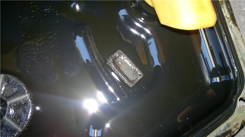 Через сливную пробку слилось примерно литра 2, отвернул ещё одну пробочку (в передней части поддона), слилось ещё литра 1.5, остатки слились после снятия поддона. Пыли и стружки на магнитах было относительно не много, частиц желтого метала (втулок) не нашёл, масло конечно было чернущее.