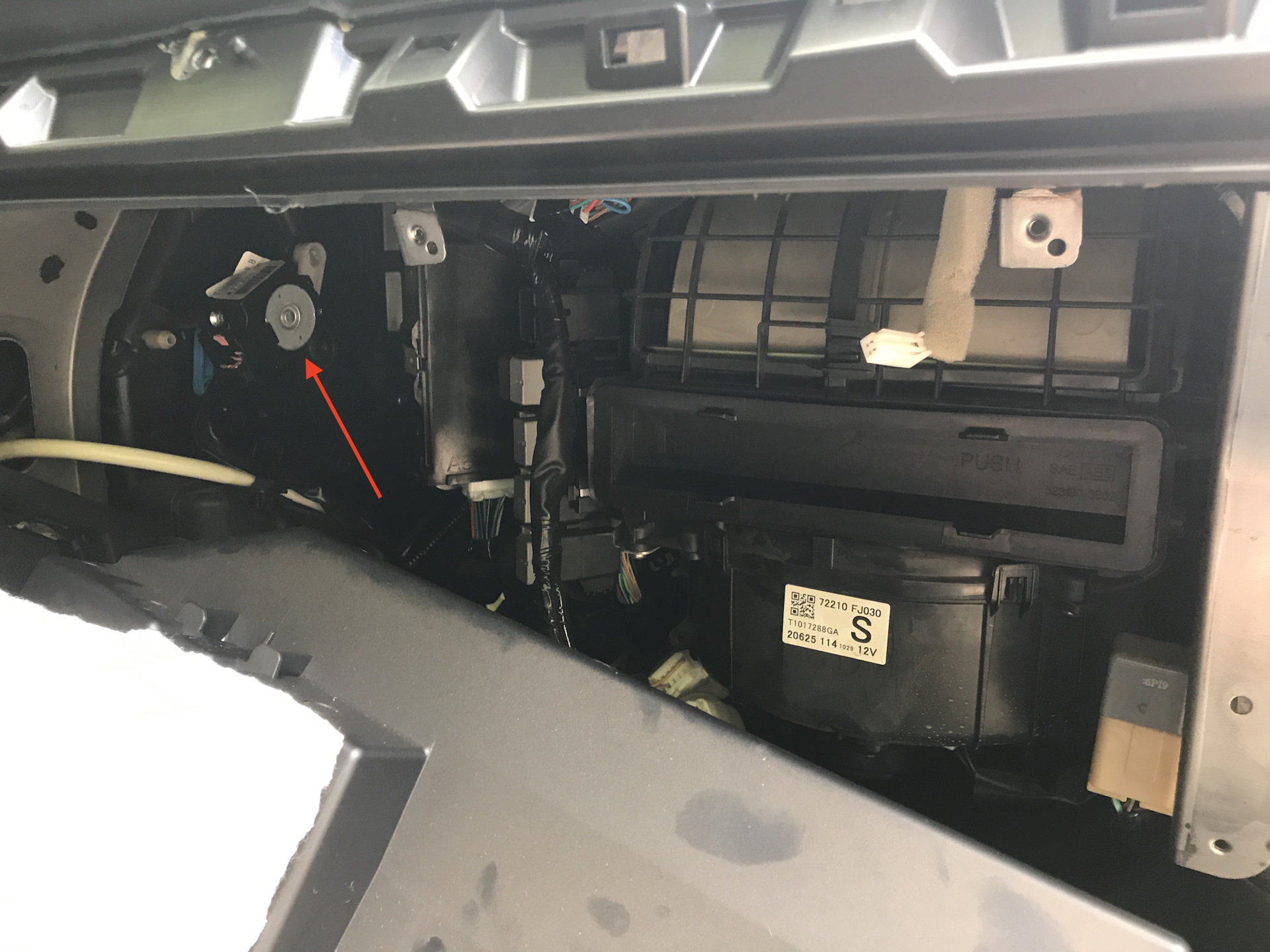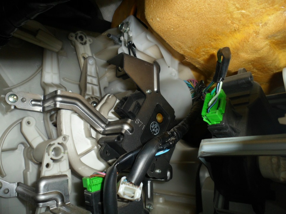 Итак лезем за бардачок где стоит салонный фильтр снимаем весь пластик и включаем зажигание и балуемся печкой чтобы узнать какой сервопривод вжикает. Опускаем его в крайнее нижнее положение чтобы открылся вид на самый верхний саморез (его выкрутить сложней всего) и отсоединяем фишку, а только потом выключаем уже зажигание (в противном случае заслонка сама сместится, и поднимется в крайнее верхнее положение закрыв тем самым обзор на верхний саморез).