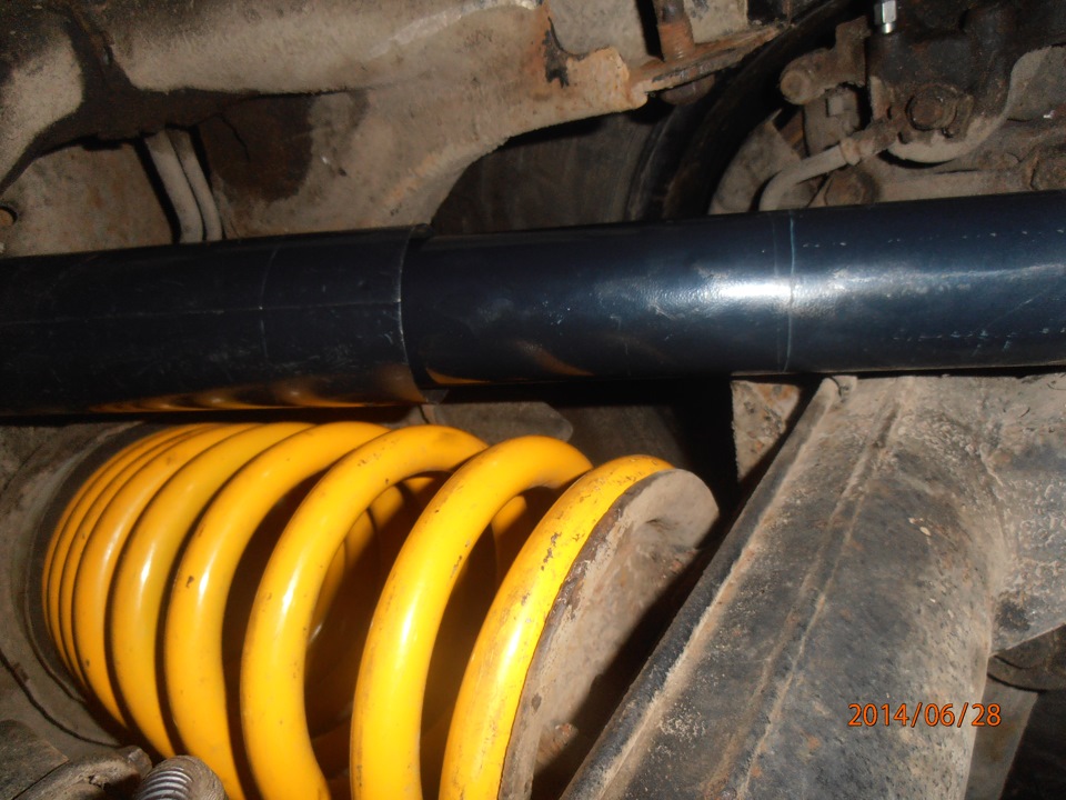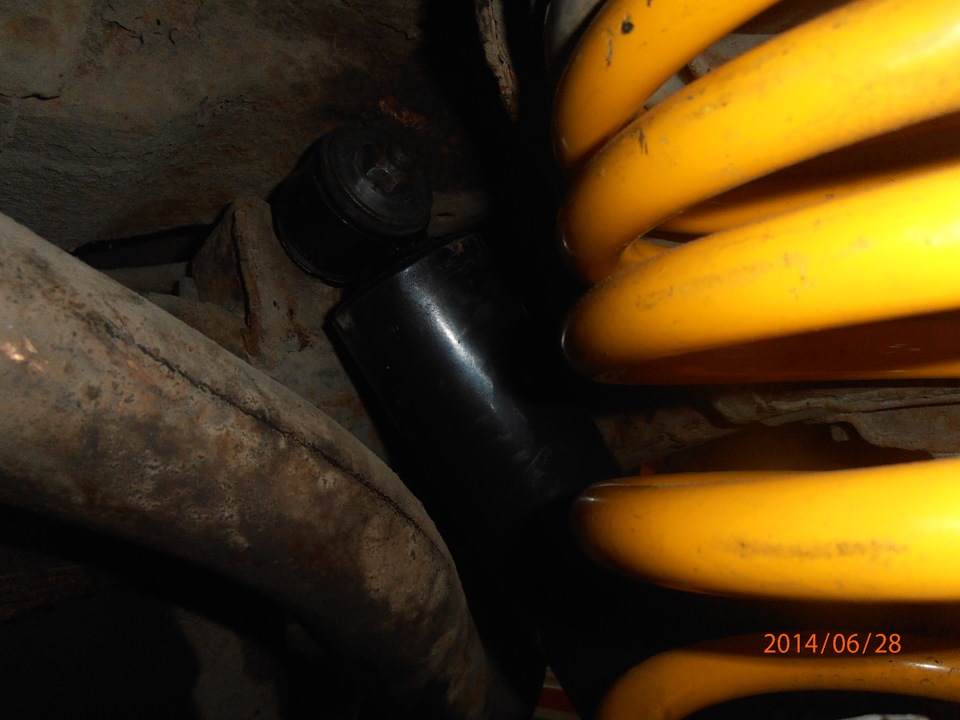 В общем, снял правую, и, поставив проставку 3см, поставил пружину +2". Так же поступил и с левой, но только проставку 2см воткнул. Вот тут пошли первые подводные камни. Первое это то что машина стала кривой, но правая сторона была выше?! Ладно, подумал я . поставлю перед посмотрим. Второе, штатные аморты, вышли на свой полный ход до риски(У меня стояли KYB Gas-a-Just). Я опять все скинул на то что перед ниже пока.