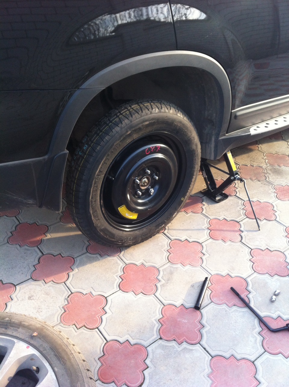 Начитавшись историй про кражи запасного колеса, решил найти способ защиты. Выбирал между докаткой и защитой механизма крепления, раньше нашел на разборка в Питере докатку от Mazda CX-7 в идеальным состоянии, цена 1000 рублей + доставка в Пятигорск ПЭК 300 рублей. Несколько фото докатки на машинке ниже. Доволен результатом на 100%. Теперь запаска поселилась в гараже, подумываю о её реализации, но еще не определился.
