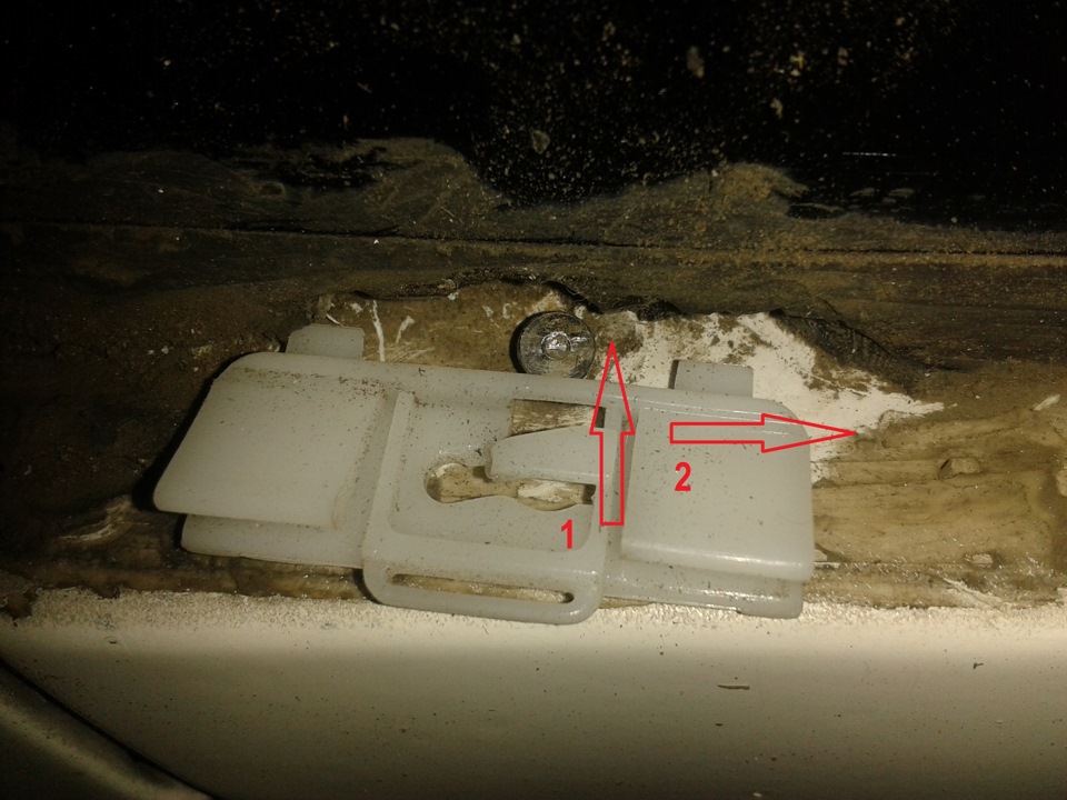 Освобождаем место для ритейнера от излишков герметика, если вдруг туда дотянулись чьи-то шаловливые ручонки. 1) Давим на ритейнер, так чтобы посадочная шляпка вошла до упора. 2) Сдвигаем вбок, чтобы она защелкнулась.