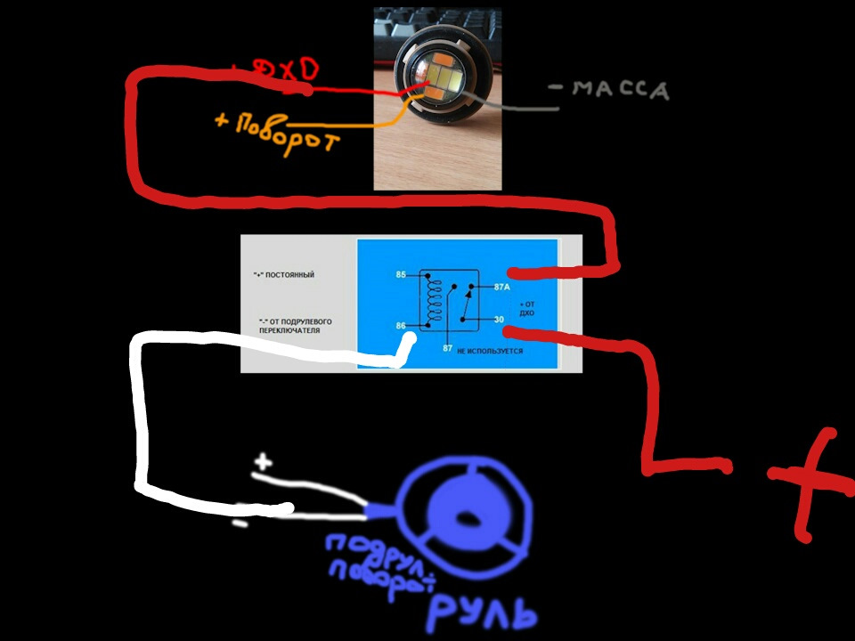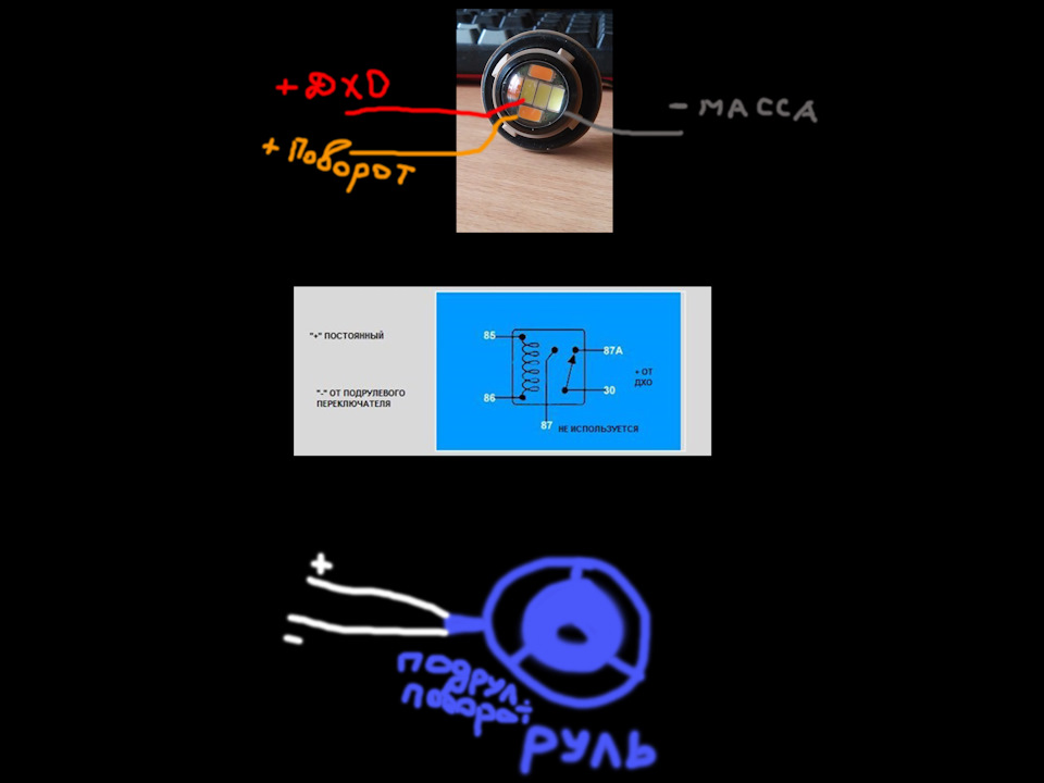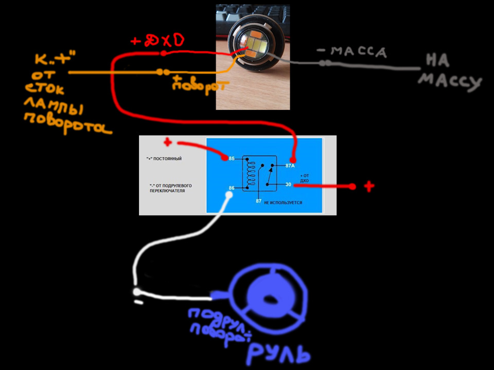 Отлично! Подскажите, видел люди подключали через реле, но у них оранж перемигивался с белым от дхо. Объясните, как правильно подключить, чтобы при включении поворотника только оранж моргал? У меня вот таких два глаза: