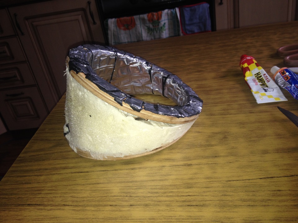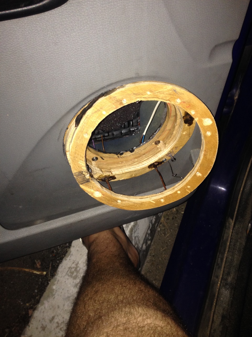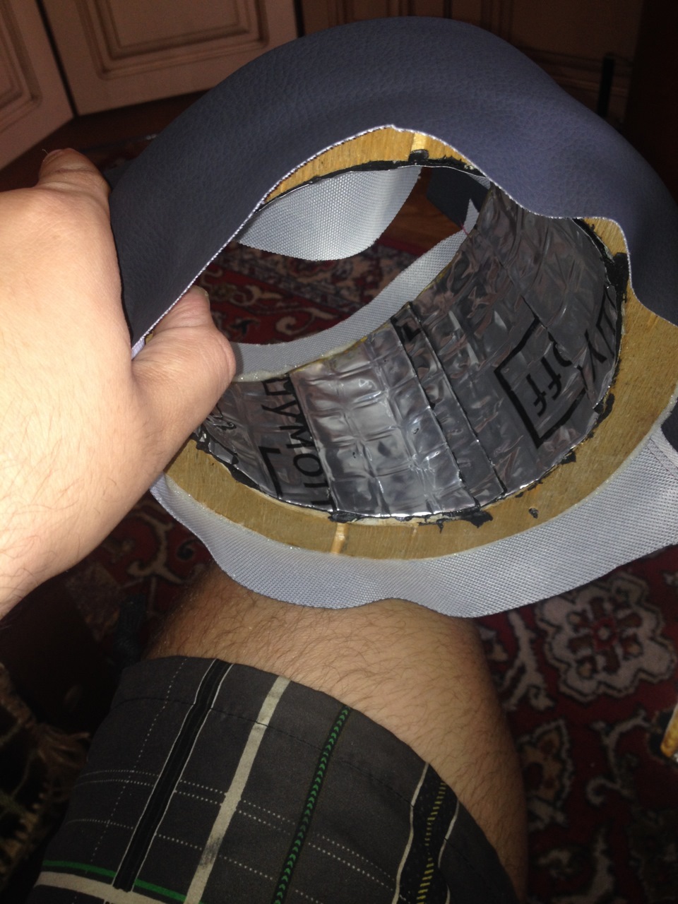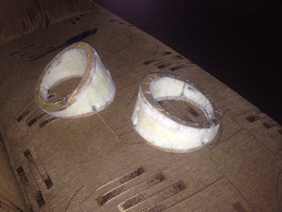 Захотелось мне "доворота". Решил все делать по давно обкатоной технологии и двумя деревянными кольцами и монтажной пеной. Далее весь подиум из нутри проклеен виброй м2, внешне обтянут паралоном 3мм и поверх красивеньким кожзамом с красной строчкой(которую в салоне нифига не видно).