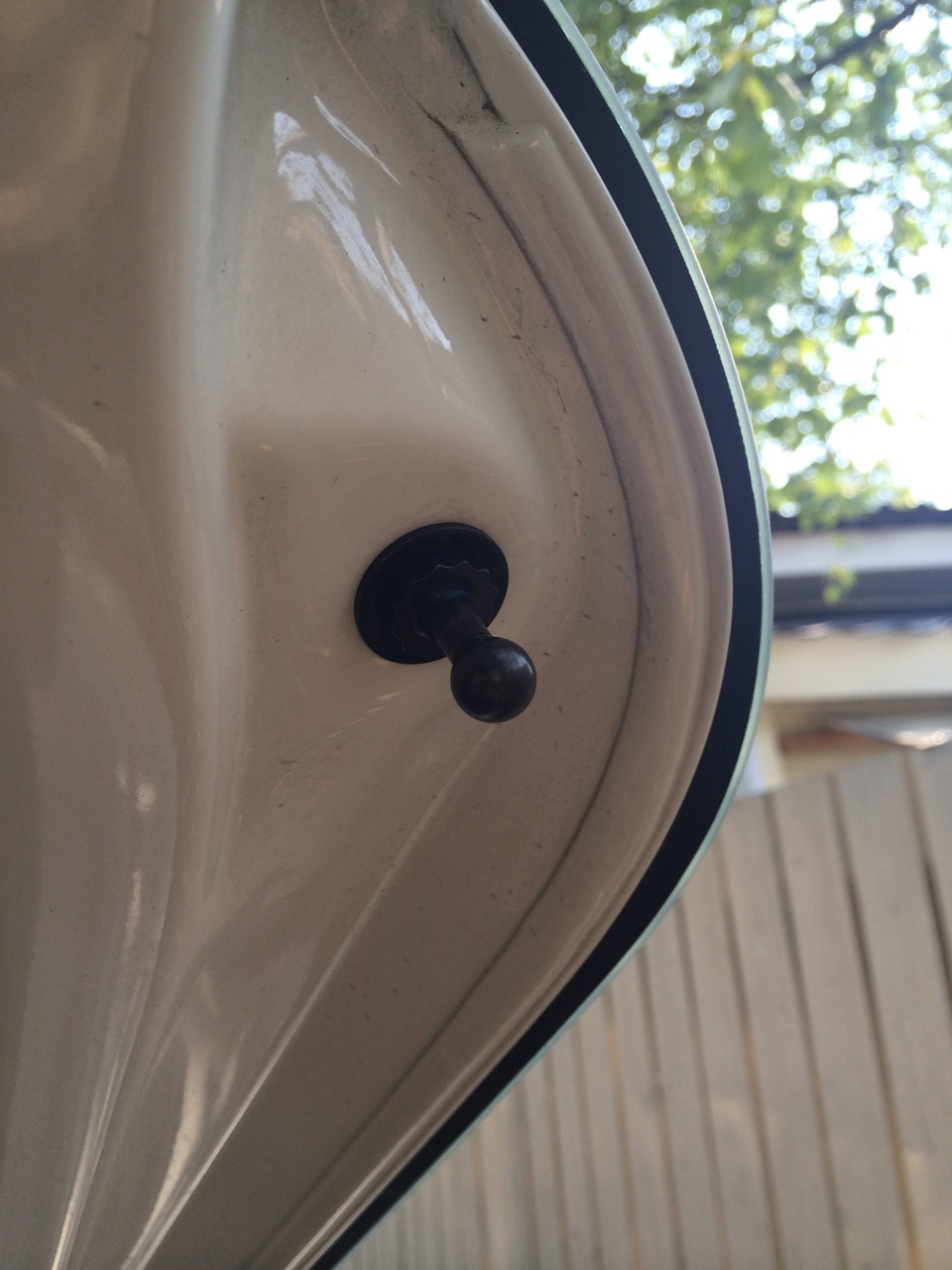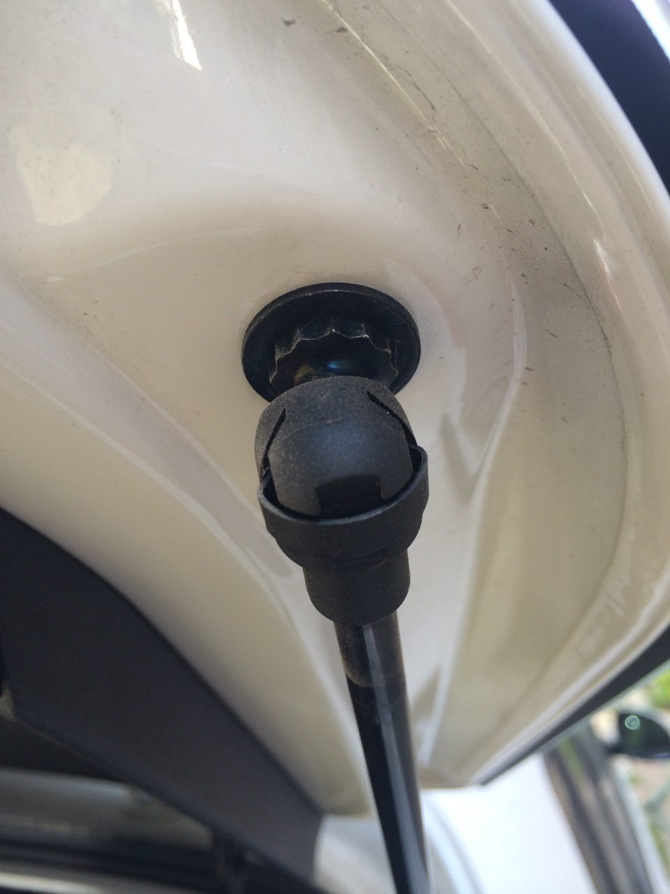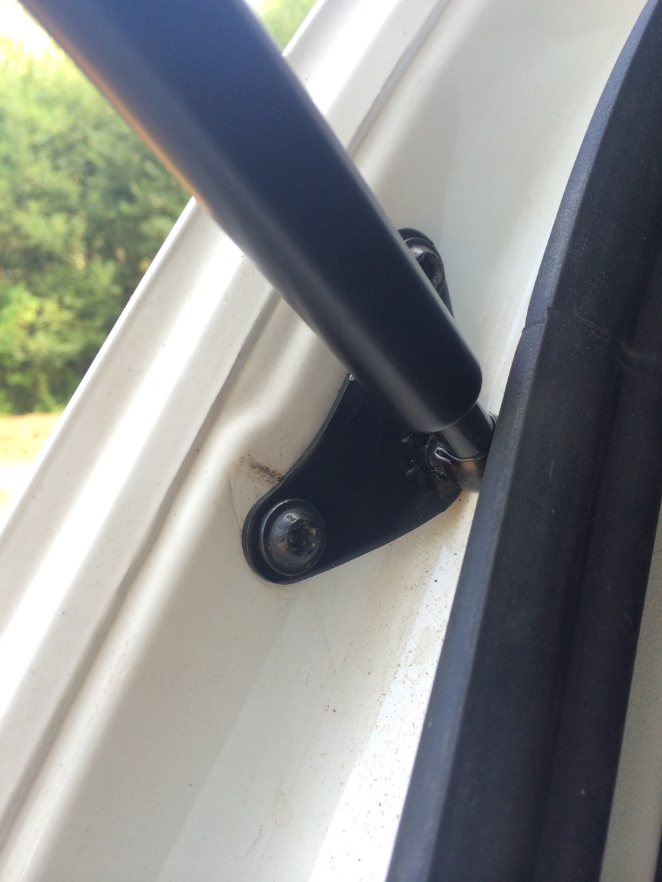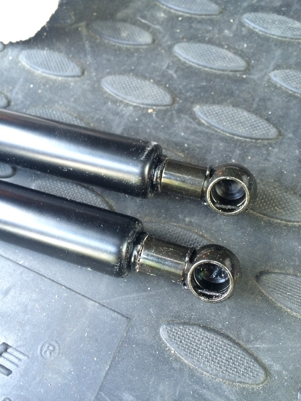 3. Далее сдергиваем штатные амортизаторы с верхних креплений, удобней делать конечно вдвоем — один держит крышку, другой работает =) Удобней выворачивать их в сторону, т.е. в бок, выходят как миленькие.