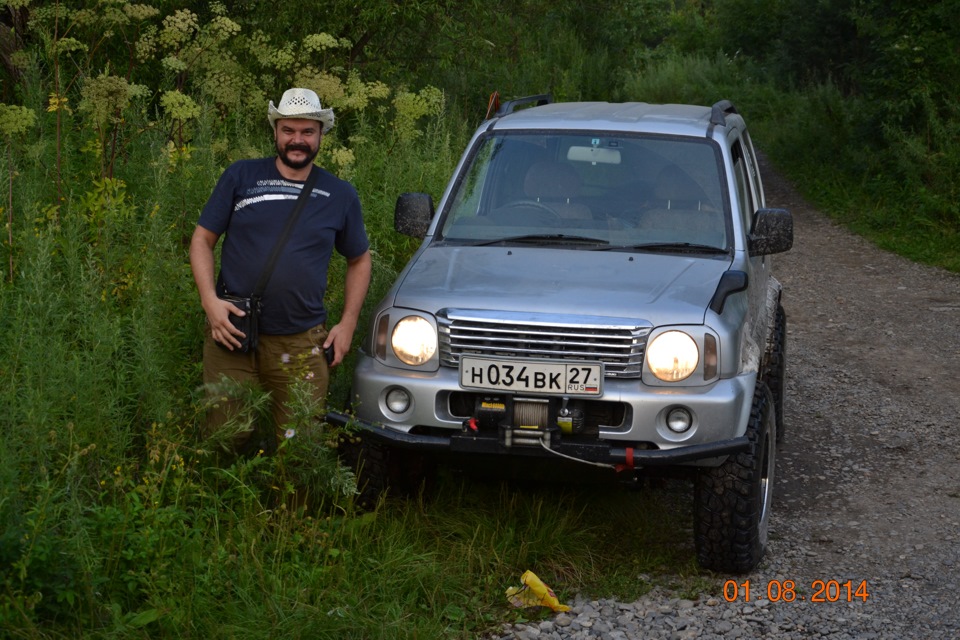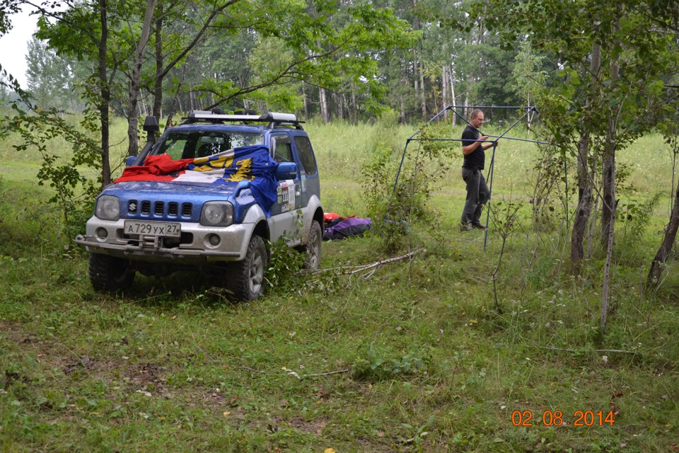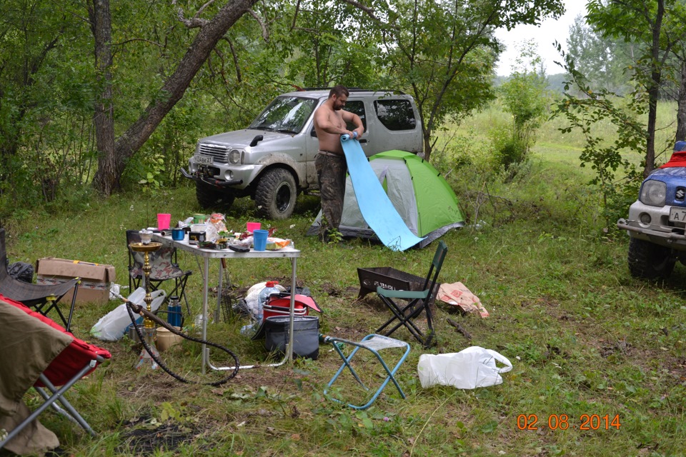 На ночь встали лагерем на одном из бродов. Использовать его не предполагалось но после 15 литров пива и бутылки водки — появилось желание "померяться шноркелями"! ;))) В смысле — измерить брод и рискнуть сейчас же проехатть его на Джиме: