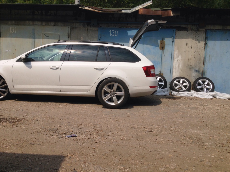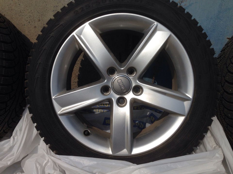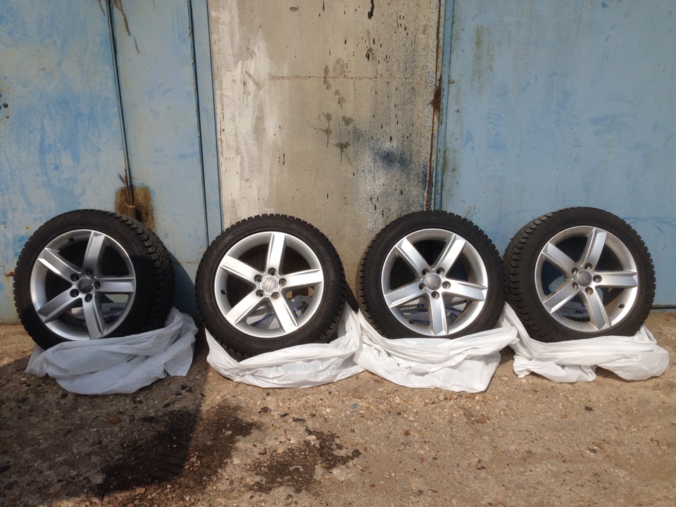 Так уж получилось что рассматривал вариант купить пока только диски R17 под будущую зимнюю резину. Но с теми дисками, на которые положил глаз, не срослось. Как-то от делать нечего просматривал рынок авто ру на предмет годных дисков, обнарушил достойное предложение по хорошей цене, от которого я не смог отказаться. В общем сегодня забрал практически новые оригинальные диски от ауди А4 с почти новой хаккой 5. Как раз хотел на эту зиму именно шип. Как показала практика покатушек на "Горелом" — на льду липучка как корова. Параметры все подходящие, кроме посадочного отверстия, оно 66,6 вместо шкодовских 57,1 но это не беда, так как уже имеется опыт езды с проставочными кольцами под 57,1, поэтому буду искать в ближайшее время алюминиевые колечки.