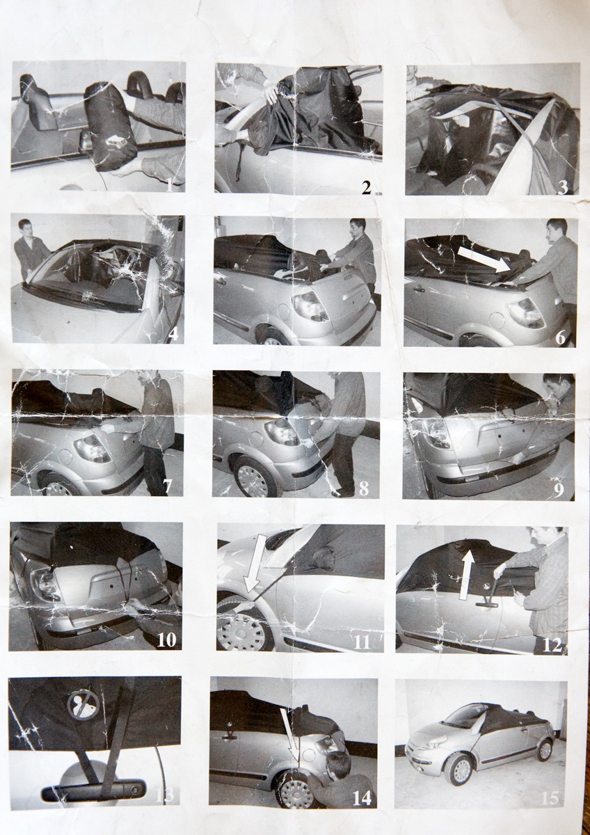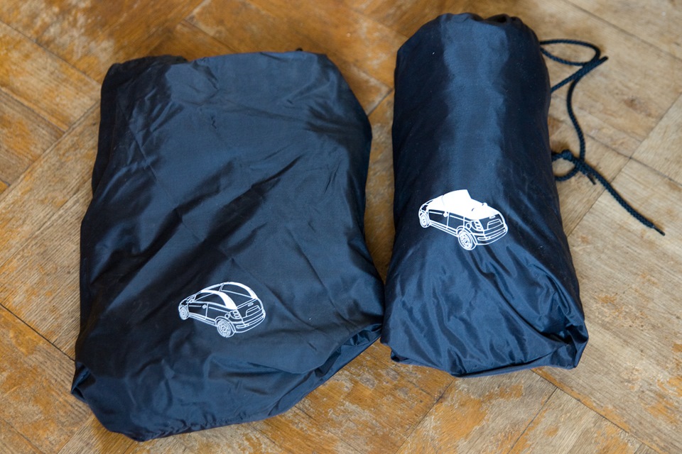 — тент для машины в варианте "родстер". Очень полезная штука — если вдруг пошел дождь, а крыша оставлена дома — можно его натянуть и переждать. При этом лобовое стекло остается открытым. Правда, на тенте есть предупреждающий значок — мол, ездить с ним запрещается )