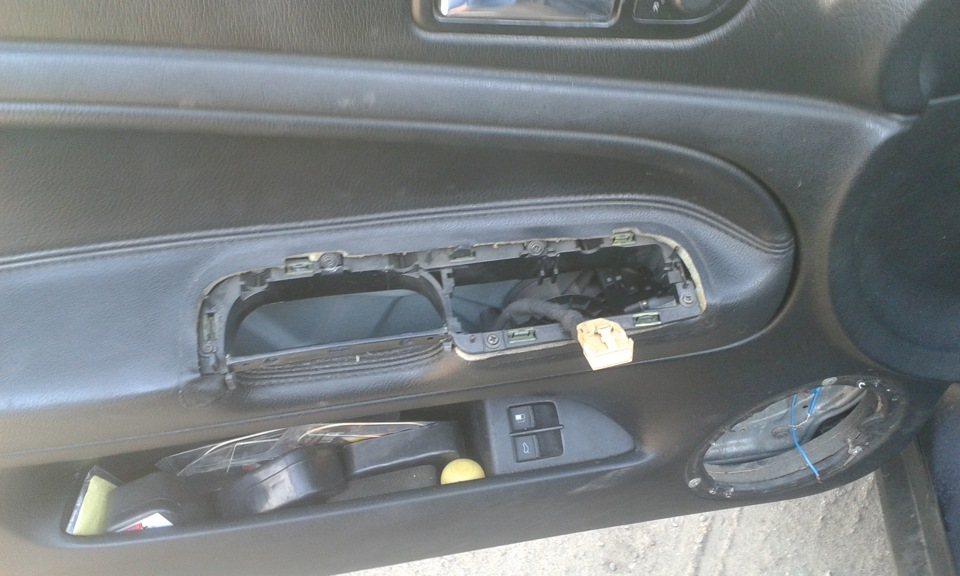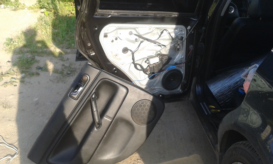 Заднею дверь разбираем так ж как и все. Снимаем на ручке накладку, откручиваем два самореза, сдергиваем аккуратно, отцепляем тросик, снимаем штекер стекло подъемника и отсоединяем пищалки, у меня пищалки стояли колхозно и проводов не было, пришлось прокладывать.