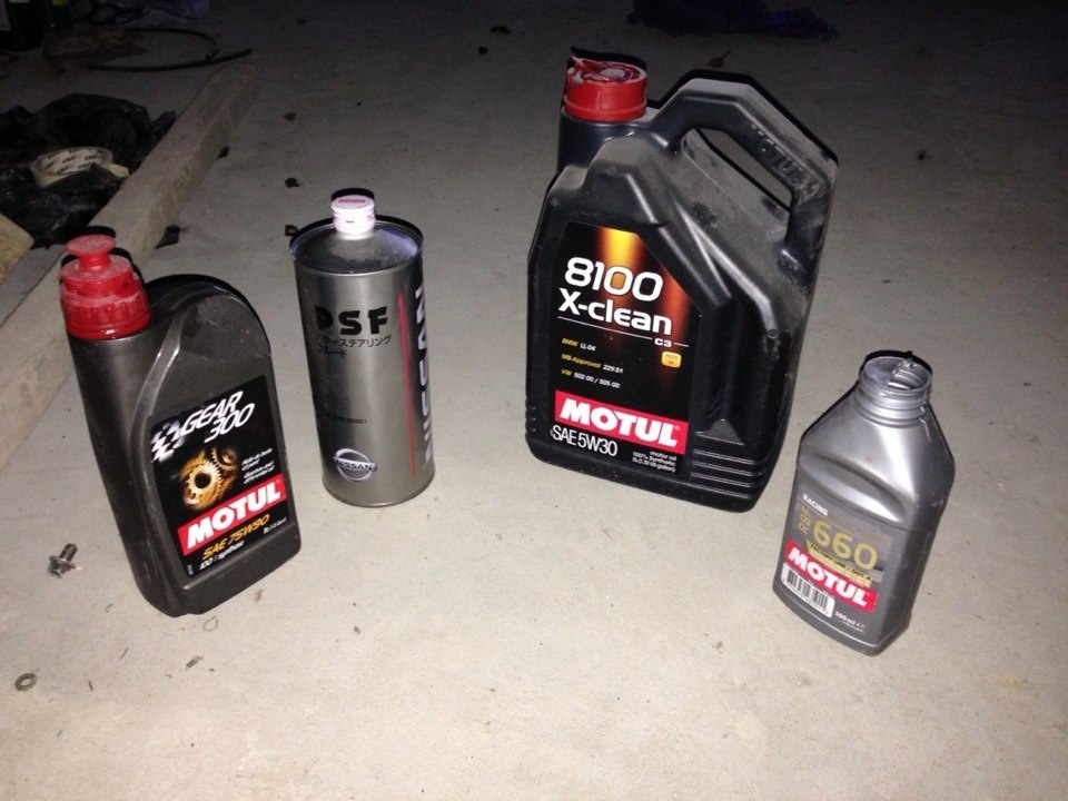 Заменил жидкость гур NISSAN PSF OEm розовая, Motul racing brake fluid, Motul gear 300 вышло 3 банки, и наконец Motul X-Clean 5w30, Лить так лить)))