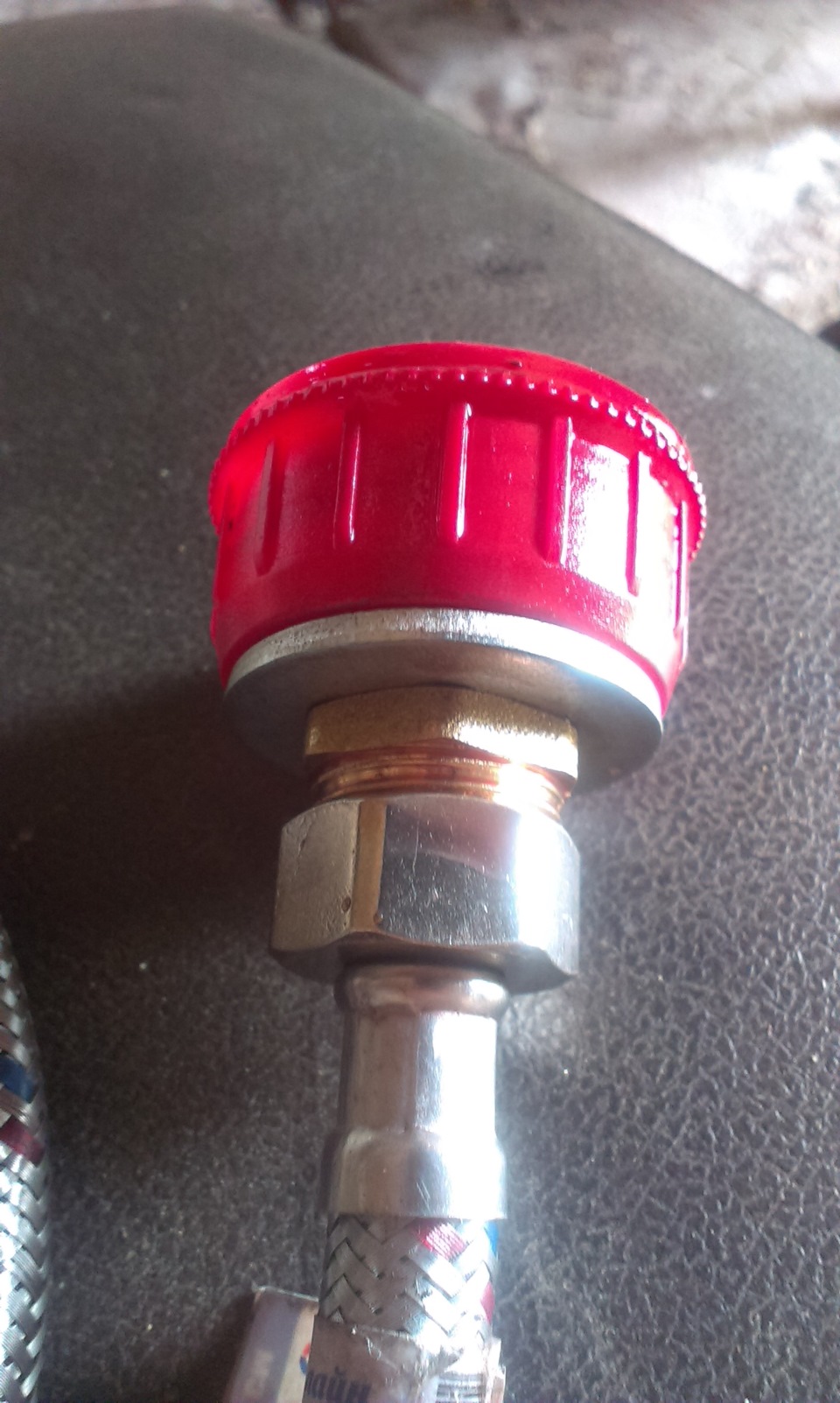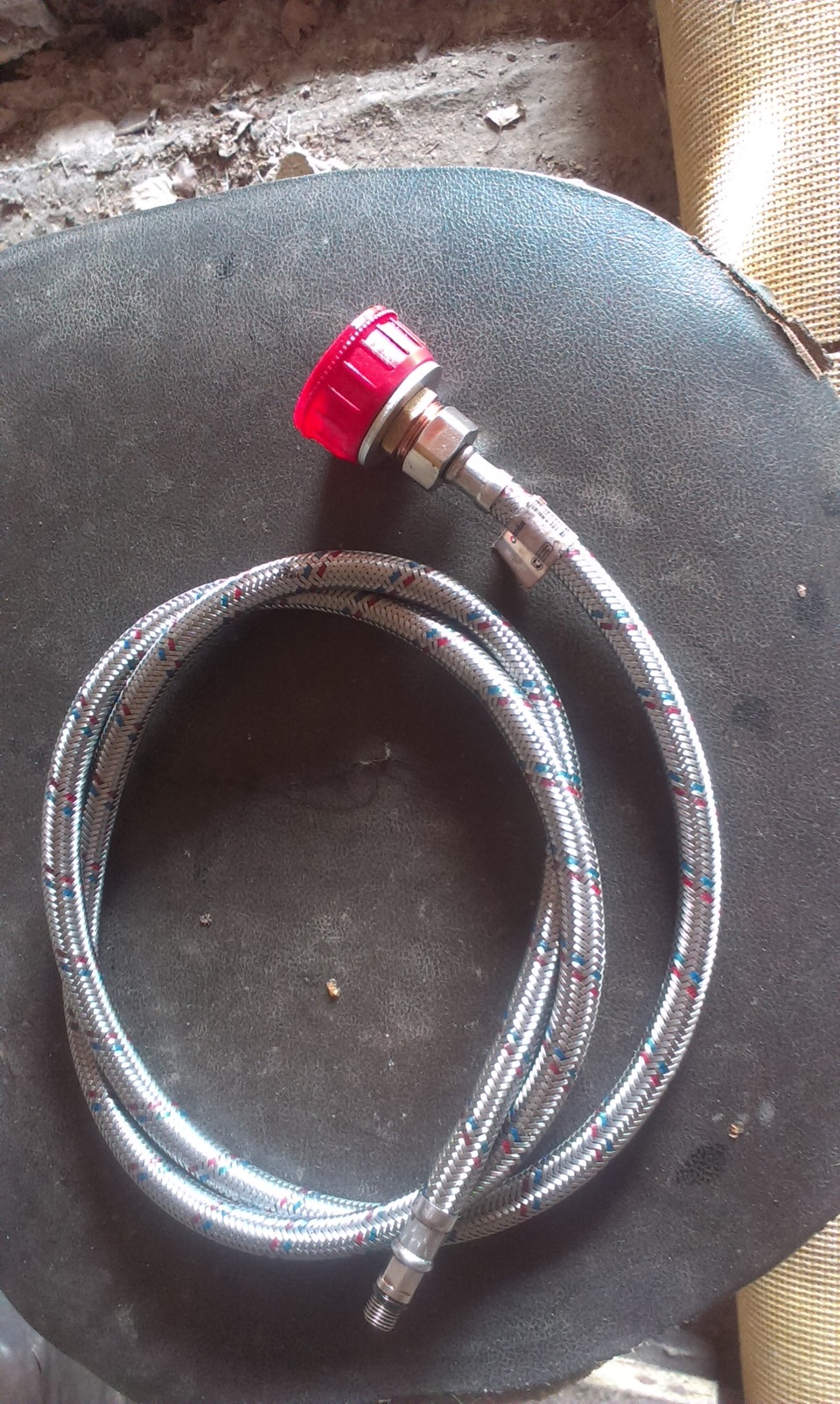 Настало время заливать новую АТФ, для этой цели было изготовлено спец устройство из водопроводного шланга, бочонка, шайбы, гайки, прокладки и крышки от банки с АТФ.