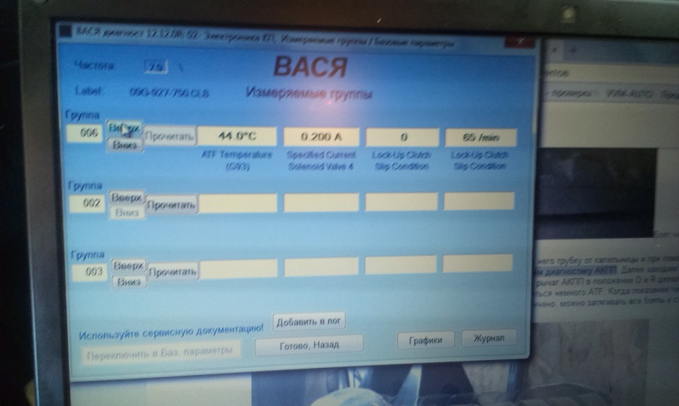 Подключаем Васю Диагноста, выбираем диагностику АКПП. Далее заходим в "Измеряемые группы" 6 или 10 канал и заводим двигатель, в первом окне появится температура АТФ.