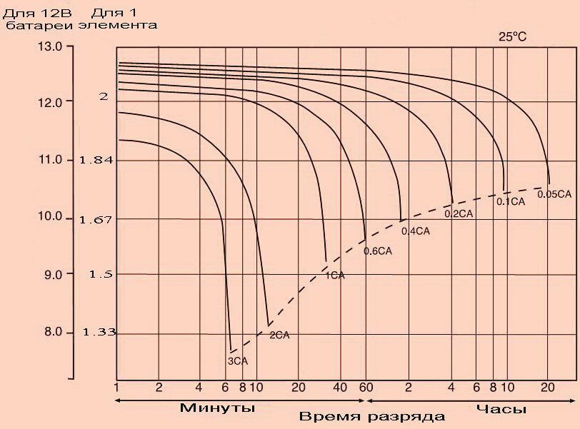 1) Из нее видно, что если разряжать полностью заряженную АКБ 20-часовым током (0,05С) в течение 10 часов, то напряжение на клеммах упадет до 12,1V. Точнее, если посчитать пиксели, то до 12,065V. Но округлим до 12,1V.