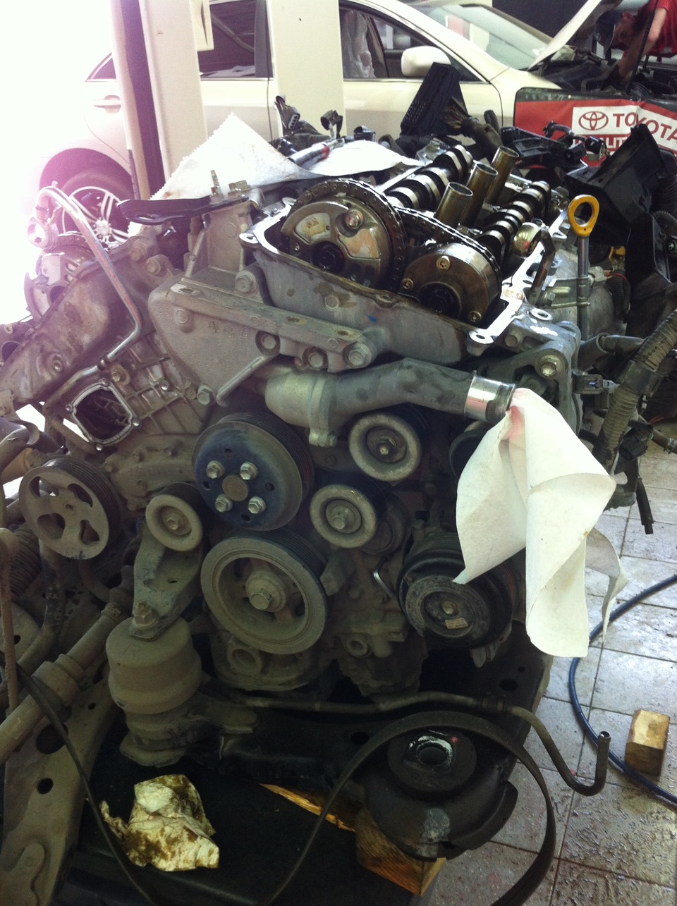 Почему же сняли с неё двигатель? Оказывается, что таким способом дилер теперь устраняет известную болезнь двигателей марки 2GR – кратковременный треск при запуске, который лечится заменой муфт VVTi.