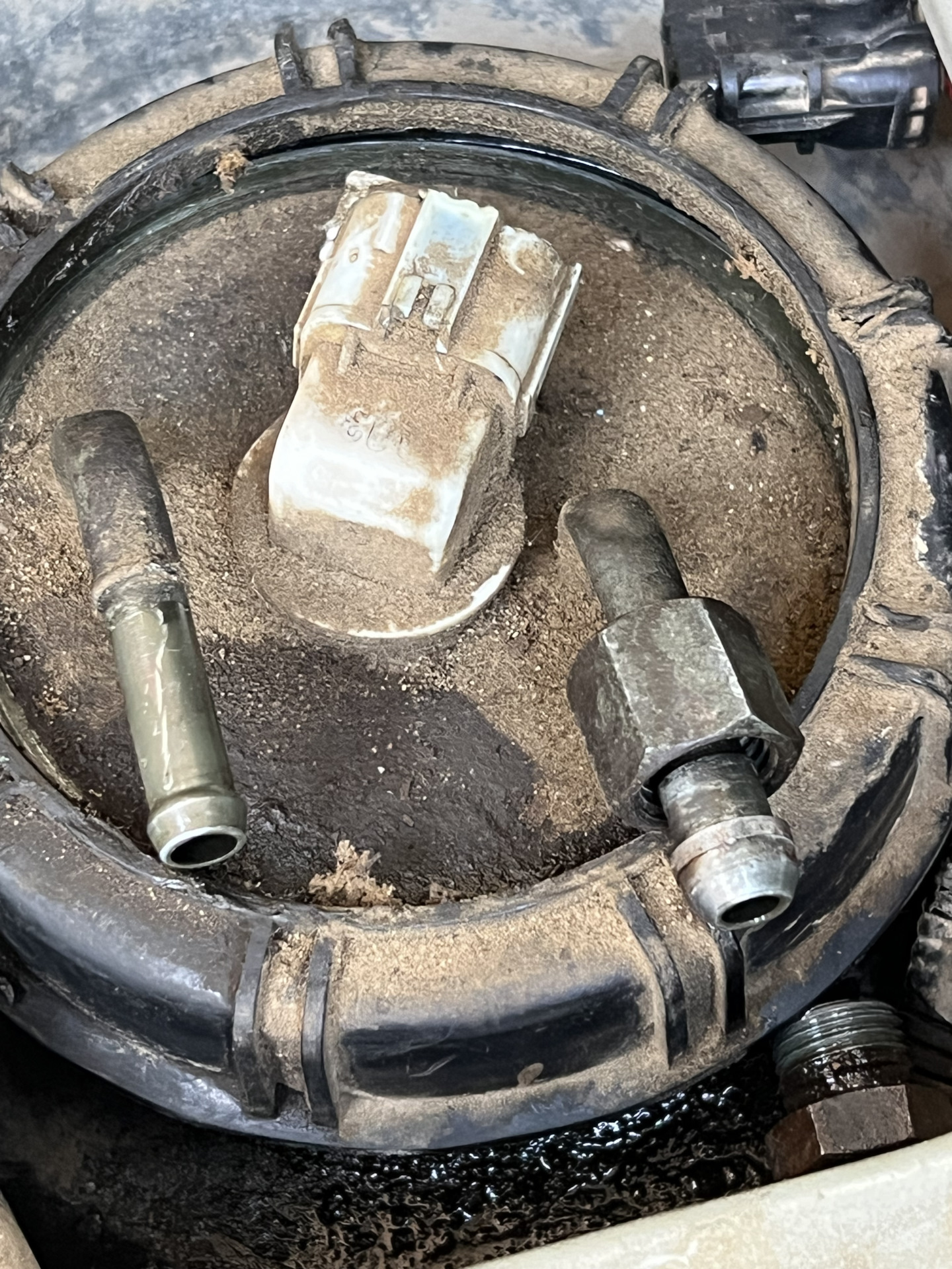 Значит пора проверить сам насос. Поднимаем ковер за водительским сидением, откручиваем 4 болта м10, открываем лючек и вот виновник, того что мы с товарищем стоим под дождем в двухста км от Москвы, часть вещей лежит в песке обочины т.к. машина естественно была не пустая, нас ждут с топливом в деревне (заглохли мы на обратном пути), руки опять по локоть в грязи, wd40 и бензине.