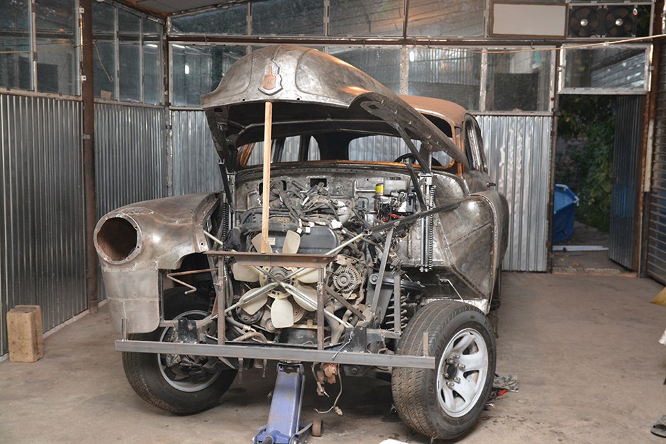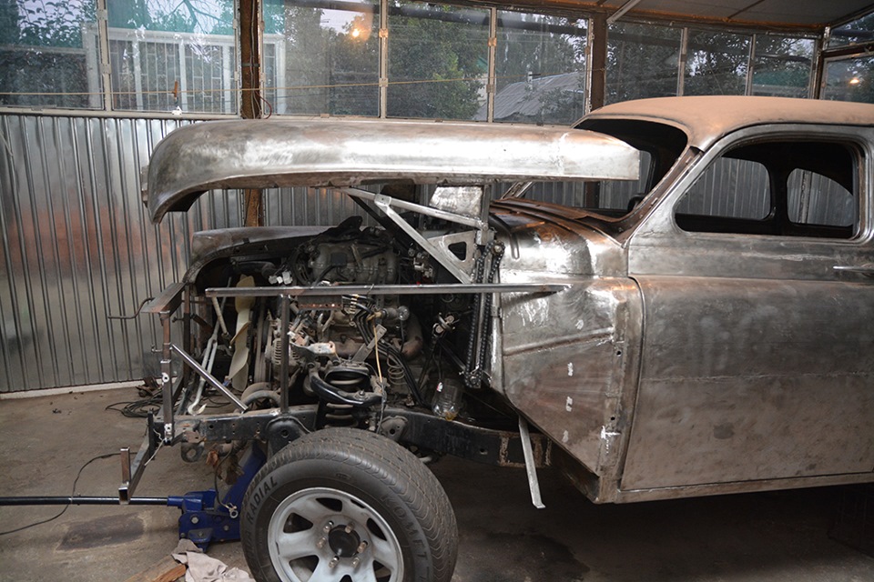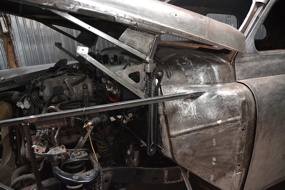 В процессе восстановления авто возникла новая проблема- сделать зазоры капота минимальными. Заводская конструкция капота не позволяла это сделать. Пришлось разработать иную конструкцию открытия капота- капот поднимается вверх механическим приводом, а затем приподнимается вверх. Фотографии представлены ниже