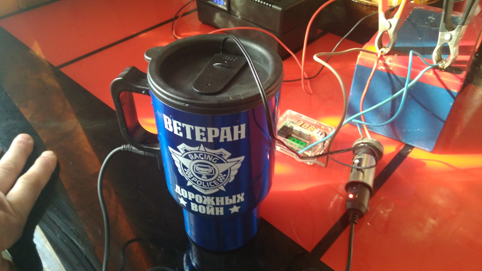 Купил сегодня подобную кружку. При 14 вольтах, потребление 3А, залил полный стаканчик воды и подключил от отдельного аккумулятора с подключенным гнездом прикуривателя. Температура воды 20 градусов, через 20 минут температура около 60 градусов, через час 80 градусов. Это очень долго, проще кастрюльку на двигатель поставить. На вид добротно, красиво, провода тонковатые, ток то не о чём, прикуриватель легко переварит 10А, а провода на кружку уже при 3А горячие. Буду думать, скорее всего надо изолировать лучше внутри и ставить дополнительную спираль или нагревательный элемент, благо повышать есть куда.
