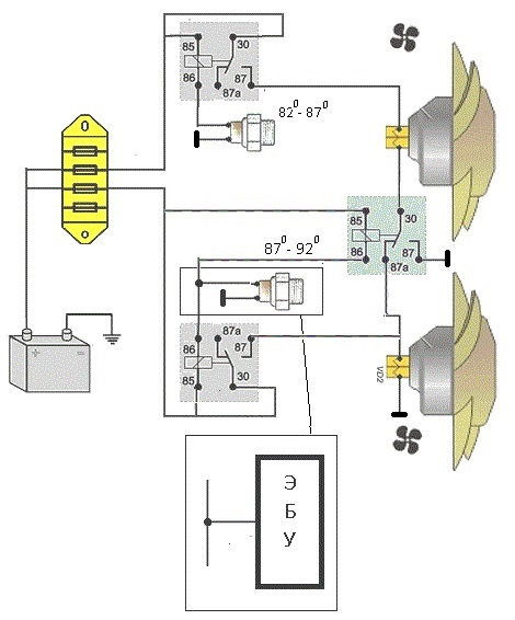 Схема подключения вот такая. Первая скорость реализована последовательным соединением вентиляторов а вторая паралельным. Для реализации первой скорости купил вот такую штуку www.12vi.ru/770/921/8176.html на ней выбираю температуру включения и выключения вентиляторов. Ну а вторую скорость выбираю по штатному датчику температуры через бортовой компьютер