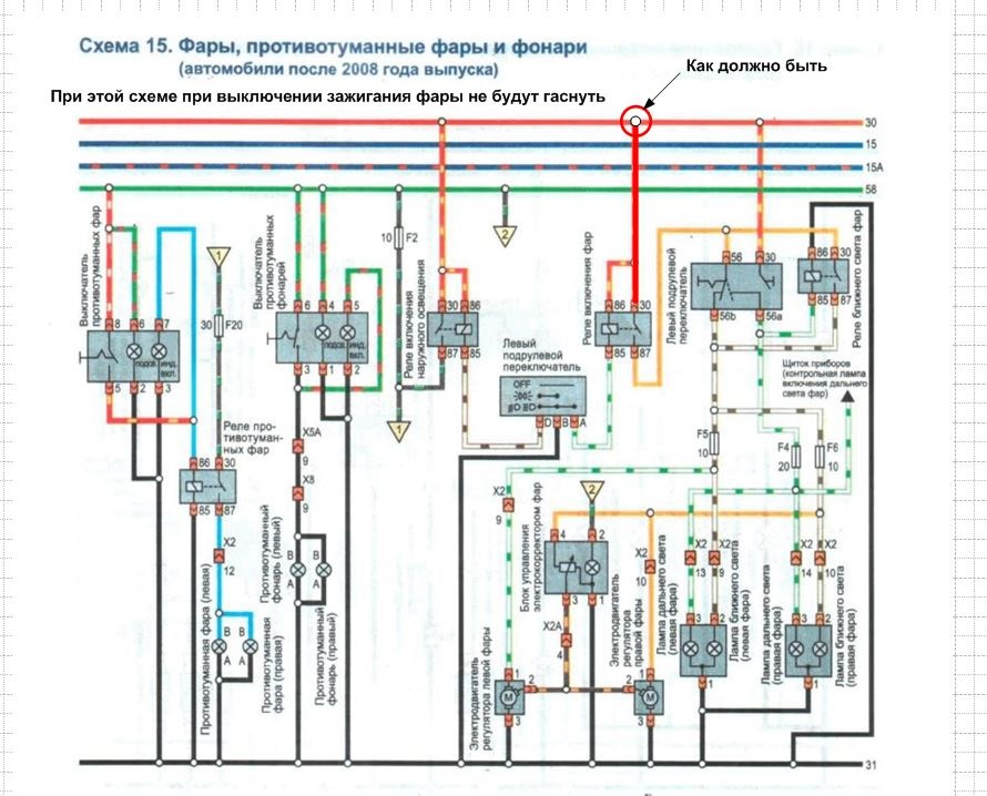 Всем привет! Вот решил написать про свою проблему с КГ, может кому поможет, в чем не сомневаюсь. Уверен что у многих именно такая же проблема по перегреву. Разгрузил я КГ еще в начале июня, разгрузил стартер и зажигание, не проверяя реле на перегрев засунул все под панель. Первая реле зажигания 30А сдохла через неделю, попалась левая, обмотка была меньше обычного. Вторую поставил качественную от Приоры, также 30А. Также не проверяя на перегрев засунул обратно, она продержалась 3 месяца. Буквально позавчера встал на Минской трассе, до реле нельзя было дотронуться, поставил перемычку и поехал дальше. По приезду домой обратился к знакомому грамотному электрику. Достали мы электрические схемы и стали разбираться с проводкой, что куда подходит. Далее поставили амперметр и стали мерить нагрузку, и тут мы увидели, что при включении фар нагрузка на разгруженное реле зажигания составляет 13А. Из этого следует, что на замок зажигания приходят и фары. Стали разбираться с проводкой. Сняли блок предохранителей, пошли от реле фар по жгуту, и опаньки, под изолентой жгута нашли заводскую опрессовку нашего провода, который должен приходить согласно схеме на провод 30, а в итоге он приходит на провод 15, т.е. на КГ. Сделали все по схеме, поставил реле корейскую, второй день езжу на полной нагрузке, включено абсолютно все, и реле еле теплое. По хорошему не надо было и разгружать КГ, а просто посмотреть проводку