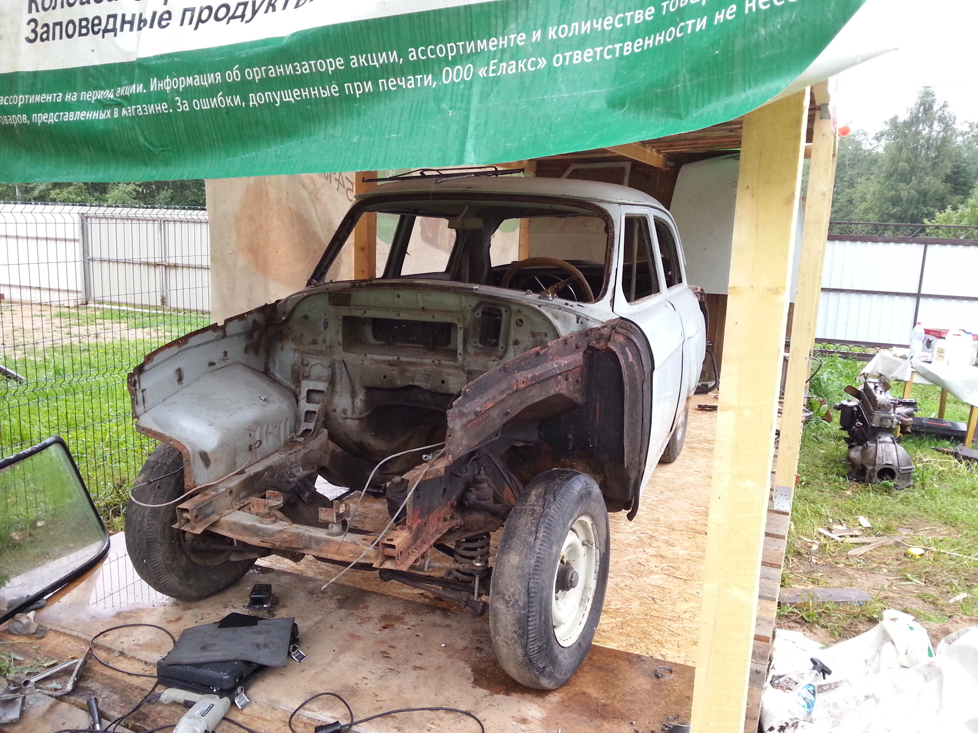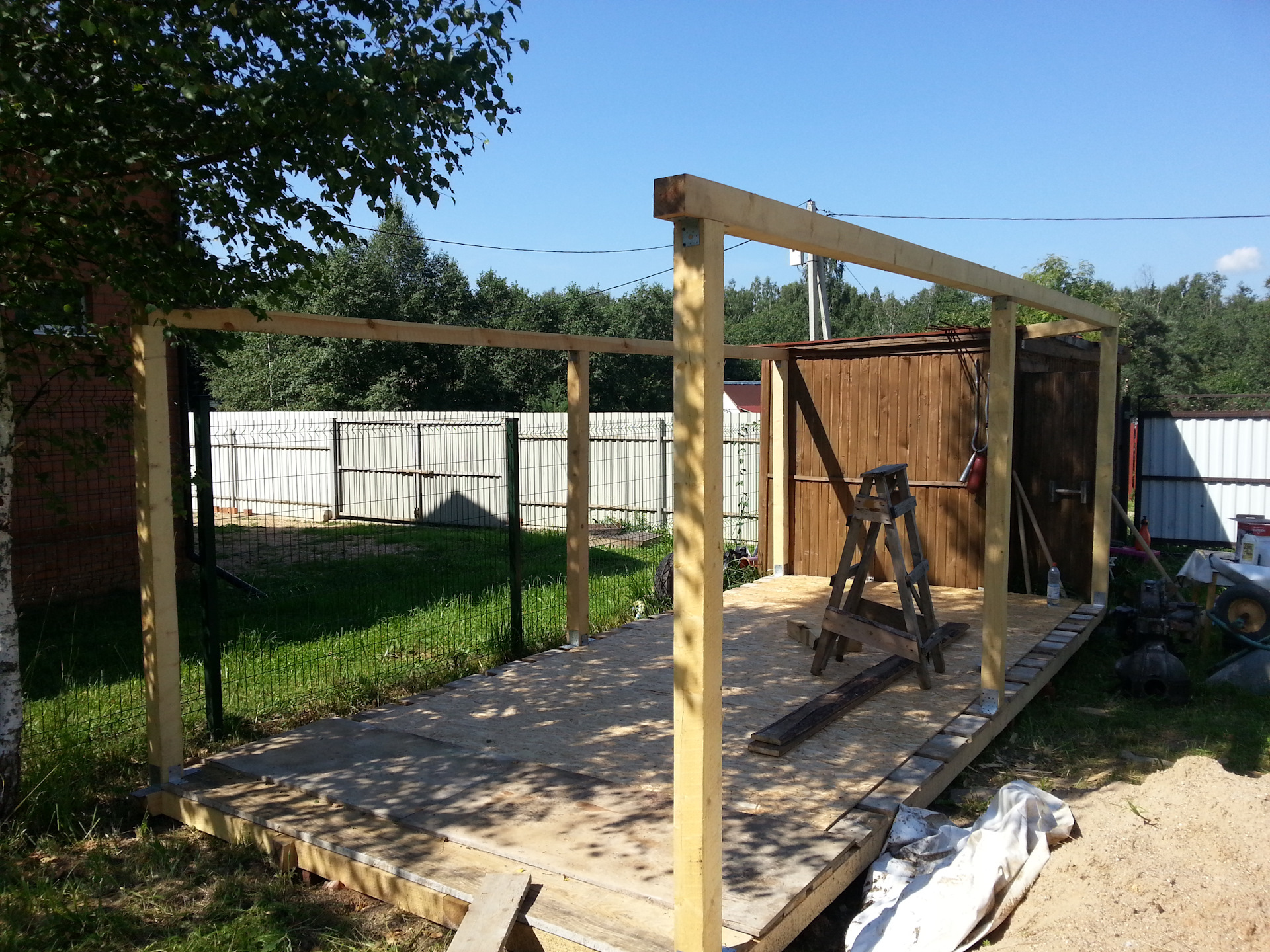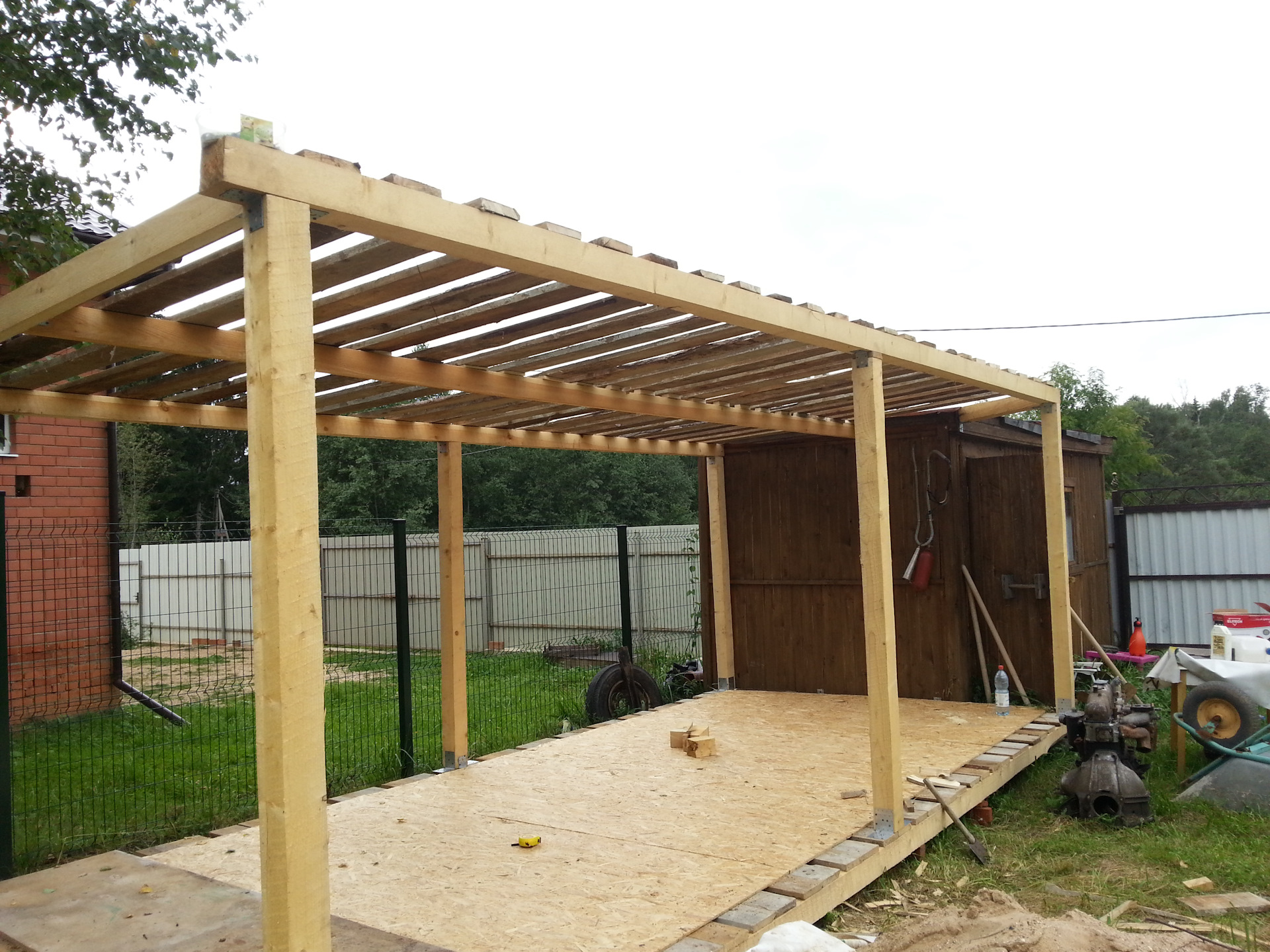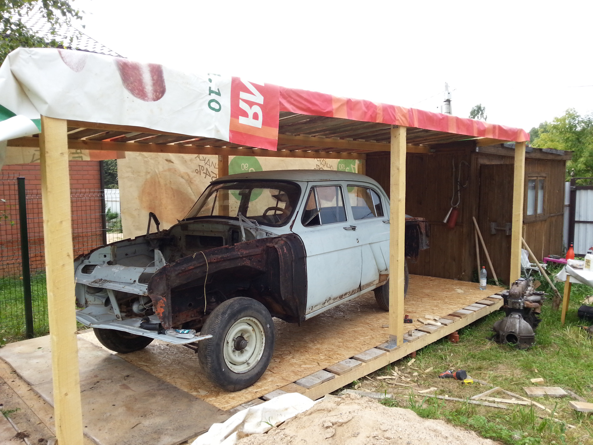 Всем привет ребята.Так многое хочется сделать, но как всегда не хватает катастрофически времени.То работа без выходных, то отпуск, надо тоже на моря сгонять.Одна суета, но как только появляется свободное время-сразу бегу к мечте.Т.к. гаража у меня пока нет и ремонт провожу на даче то замутил я сделать навес для машины.Скоро дожди с белыми мухами.Купил брусок, доски и Юсби .Банером накрыл.