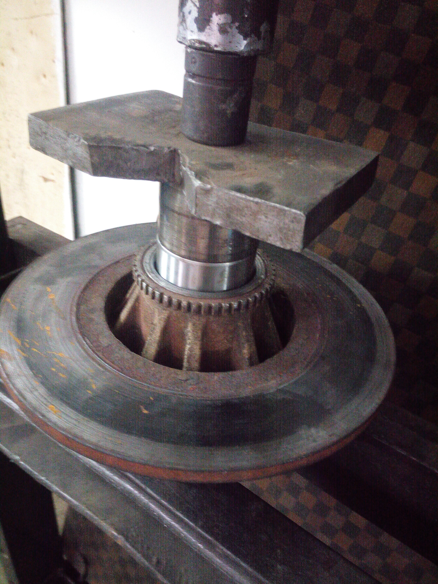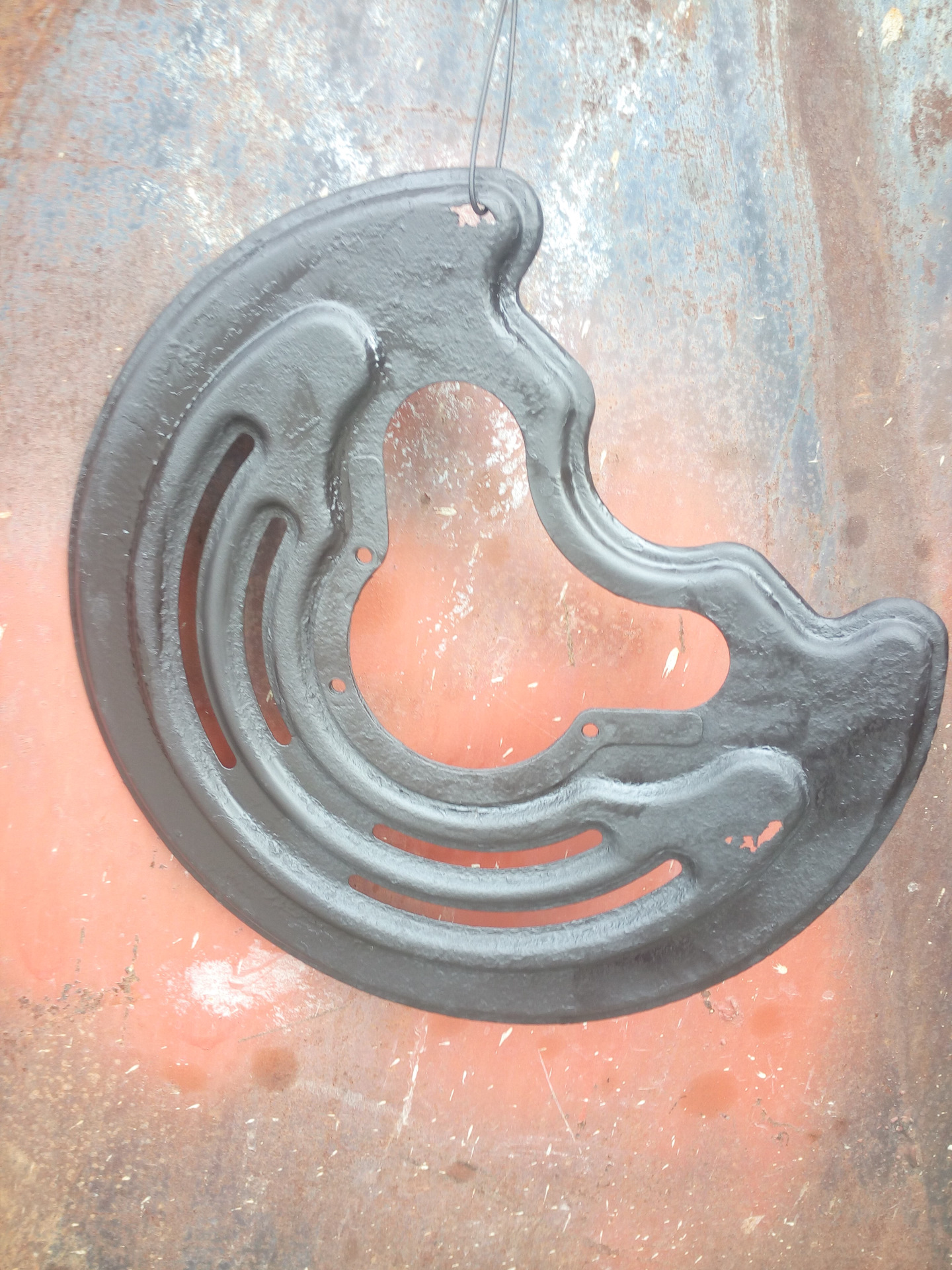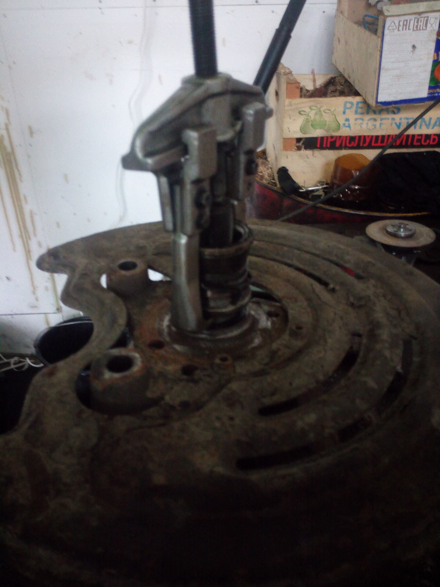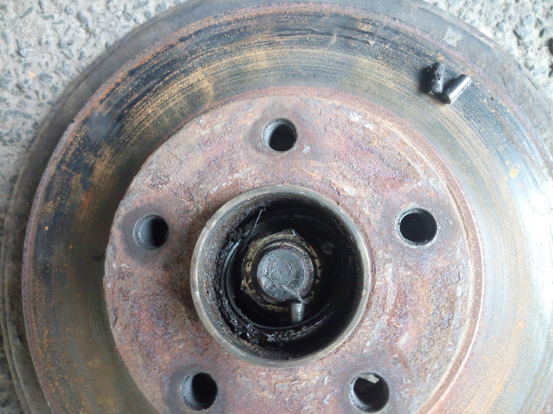 ПРиехав на эвакуаторе домой, поставил во двор, ушел спать. На утро поехал заказывать запчасти. Про запас заказал колодки, и подшипник с кротчайшим сроком доставки. Сегодня в обед получил ступичный и уехал ставить. Во дворе смотрели на меня, как на психа, чёйта мол во дворе машину разбирает, сервиса чтоль нет? Сняв колесо, выковырял отвёрткой заглушку ступицы и одел колесо обратно. Одев, попробовал выкрутить ступичную гайку, не смог. Пошёл другим путём, снял колесо 5 болтов, снял суппорт 2 болта и открутил ещё 4 болта крепления ступицы. Убрав всё лишнее в багажник, оставил авто во дворе на треноге, специально у бати в гараже забрал, а то мало ли дураков кому домкрат мой приглянется)) Уехал в серви, где очень хорошие ребята работают и в этот раз сервис их оказался на высоте. С не малым усилием открутили таки ступичную гайку, а перед этим располовинили подшипник на часть с внутренней обоймой и внешней. Открутив гайку поставили съёмник на внутреннюю обойму и освободили место для нового подшипника. С внутренней обоймой тоже не было проблем, пресс работает и руки правильно растут. Пока снят подшипник было решено покрасить стальную защиту заднего диска уж больно ржавой была. За ранее приобретённая краска для покраски суппортов была востребована) Дальше немного фото.