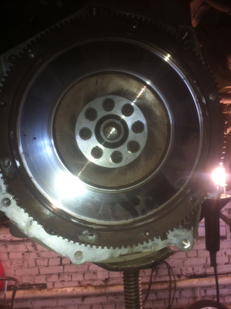 Когда я увидел свой маховик и выработку на нем, слезы радости и счастья катились по моим щекам! Выработки нет от слова СОВСЕМ (сказалось то, что я никогда не ланчевал на этом сцеплении, не пулял с места…ни разу), следов перегрева — тем более, но главное — замер. Замеряли раз 100, и так и эдак, штангенциркулем! В итоге намерили 12 мм + износ (который кстати еле еле ощущается пальцем, вобщем его нет). Получилось что-то около 12.1мм, отправляю Жене данные, он пишет "Ставь смело комплект ВР6, удачи") Ставим комплект, все садится как там и родилось, что несомненно, дико обрадовало.
