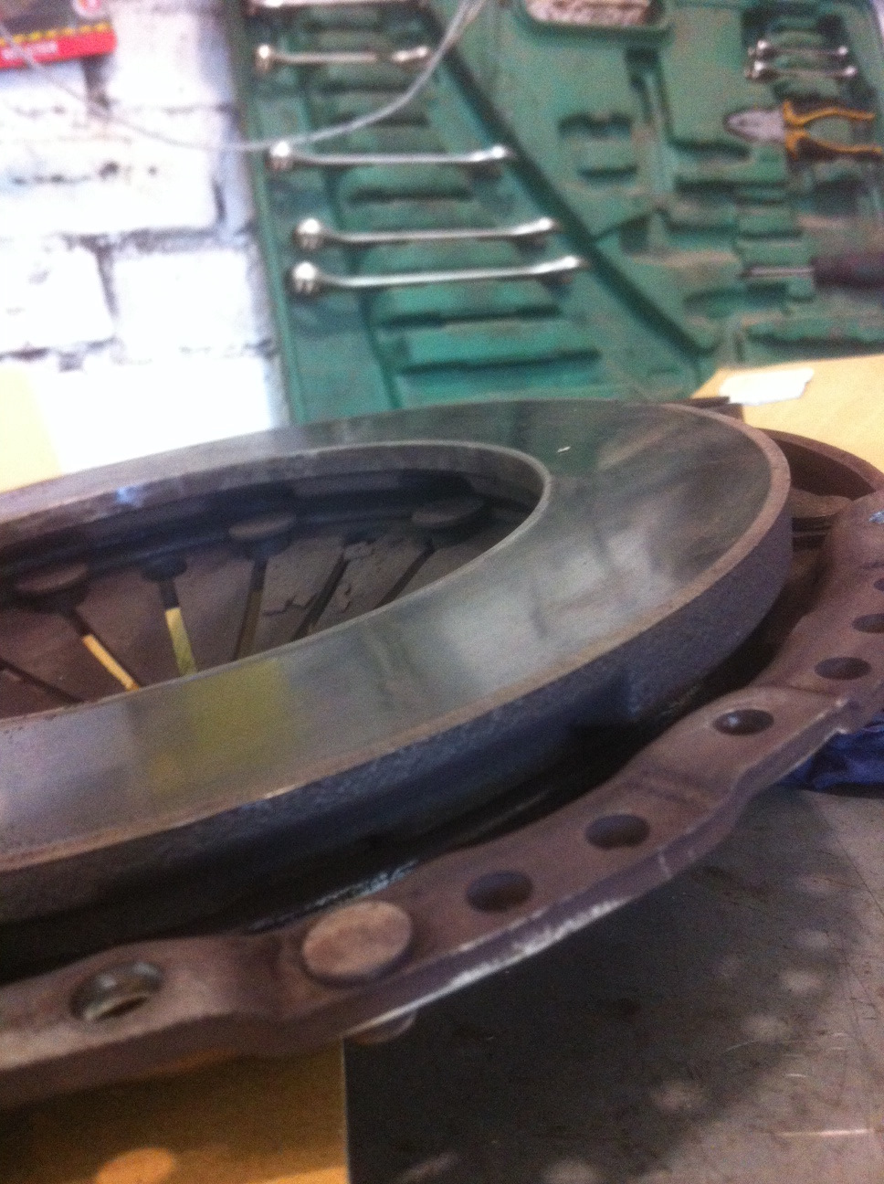 Но это пол беды…так как опыта установки в маховик Клатча (да еще и стальной), почти нет. Люди либо ставили на корзину и маховик просто диск ВР6, либо извращались по другому, но не суть. При разговоре с Женей, был выявлен один момент, что обычно у Клатча после его жестких фрикционов, маховик и корзина сильно изношены, а значит просто установить комплект ВР6 ставить нельзя, нужно точить маховик (его фрикционную часть и посадочную плоскость под венец), чтобы компенсировать износ. Признаться этот момент меня ВООБЩЕ не радовал, так как хороших токарей пересчитать по пальцам правой ноги, да к тому же точных цифр сколько точить и прочее я вообще не знал. Договорились с Женей о том, что я снимаю свой Клатч, замеряю расстояние от фрикицонной части маховика до верхней плоскости венца (прилегания корзины) и сообщаю ему, он говорит необходимо ли точить маховик и насколько + необходимо было смотреть на его износ фрикицонной части, так как она у многих изнашивается не равномерно. Я весь на нервах провел 2 дня до визита на сервис, параллельно переписываясь с Viadrus? где он и я выдвигали различные теории о том, что делать если маховик будет вхлам, как поставить диск ВР6 в корзину клатча и прочее. Вобщем вынесли друг другу мозг конкретно, но Женя расставил все по своим местам, сказав что "выкинь нахрен этот клатч и не вздумай ставить от него корзину, хватит с тебя и маховика".