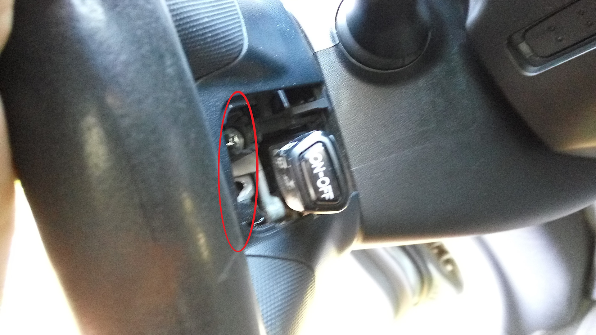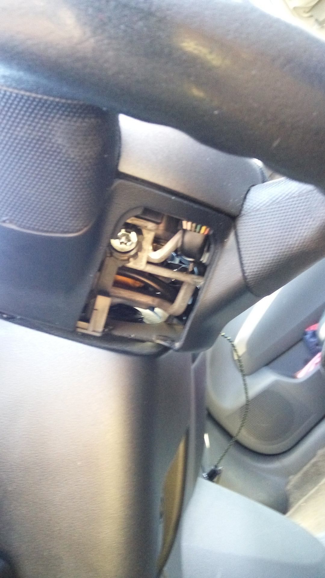 После снятия руля откручиваем 3 болта на кожухе рулевой колонки, 2 болта с ручки регулировки положения рулевой колонки, снимаем ручку и снимаем пластик (кожух)