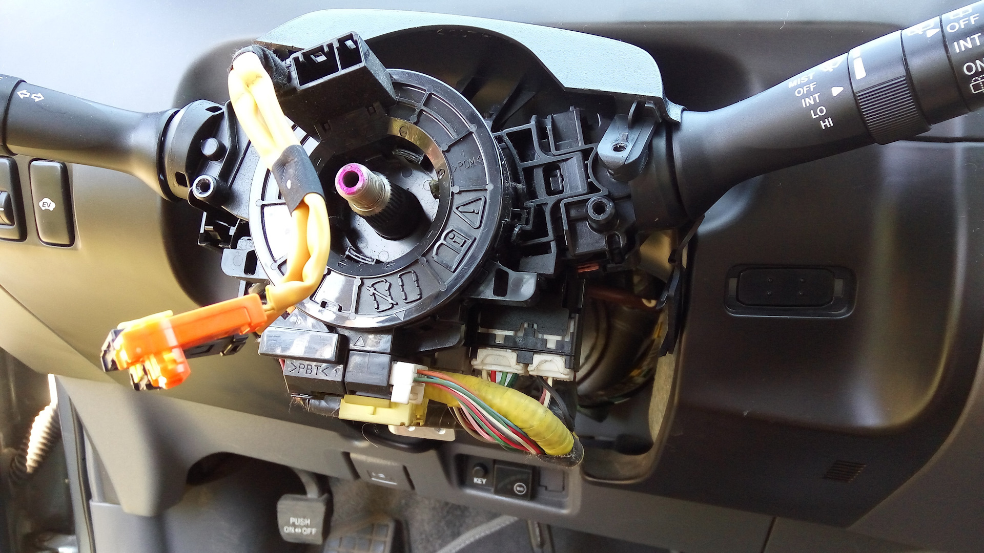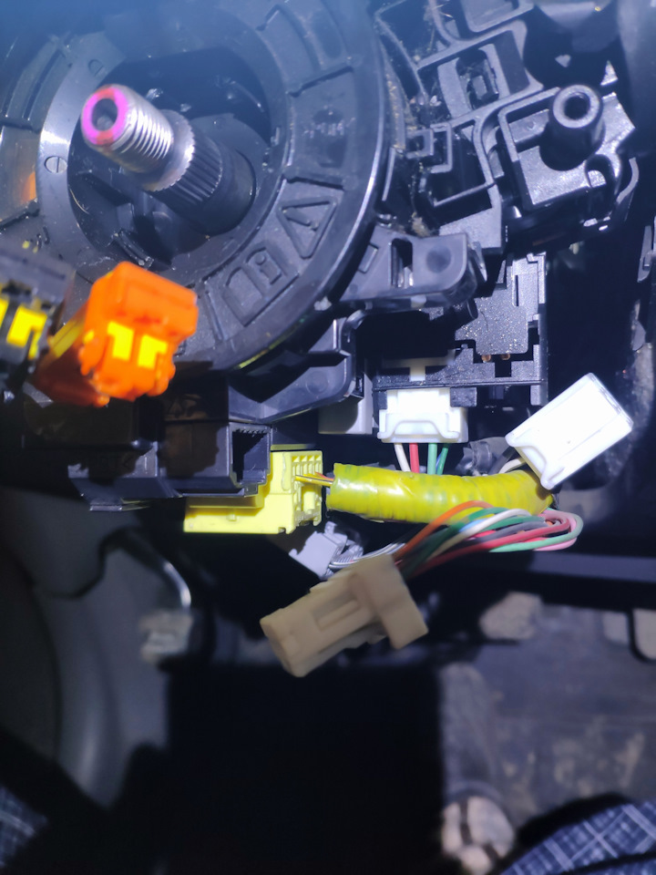 Так датчик переставили, теперь ставим всё на машину. Перед тем как пихать разъемы в новый шлейф не лишним будет удостоверится что они легко входят. Т.к. не все штырьки/ножки в шлейфе на одном уровне при "насильном" запихивании разъема ножки можно согнуть и выкинуть после этого шлейф. И так ровняем ножки и аккуратно подключаем шлейф. ПРОВЕРЯЕМ ЧТО ПОДКЛЮЧИЛИ ВСЕ РАЗЪЕМЫ (причина второй разборки). Если подключили всё, то отламываем оранжевый фиксатор на шлейфе, ставим руль, подключаем остаток проводов, прикручиваем подушку, ставим заглушки и подключаем аккумулятор.