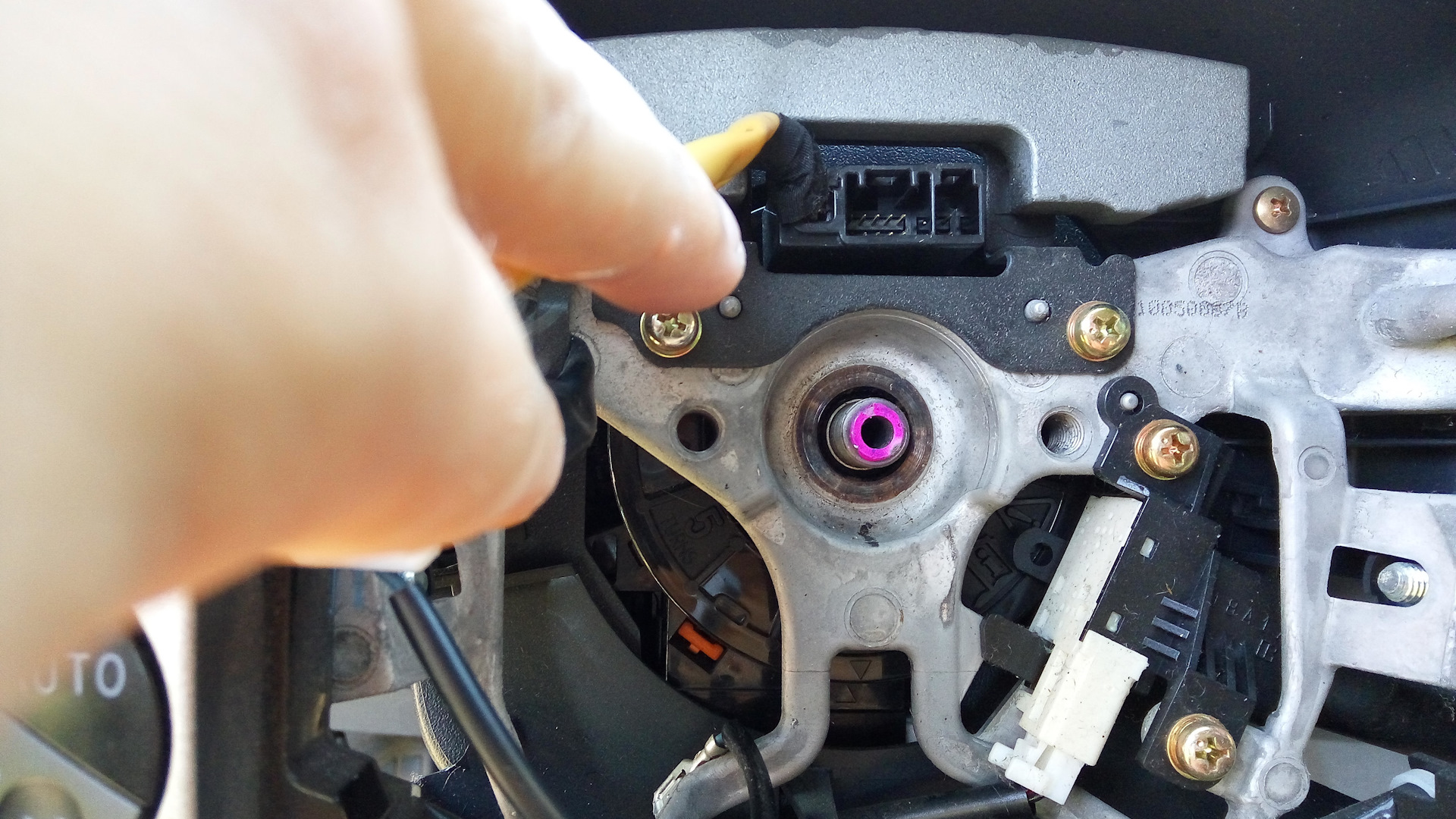 Далее отковырять на руле 2 заглушки, за ними найти 2 болта под звездочку (их тоже выкрутить). К слову заглушки не маленькие совсем, а здоровые. На фотках заглушки уже сняты. Одна из заглушек может служить крышкой для круиз-контроля, если он у Вас есть.