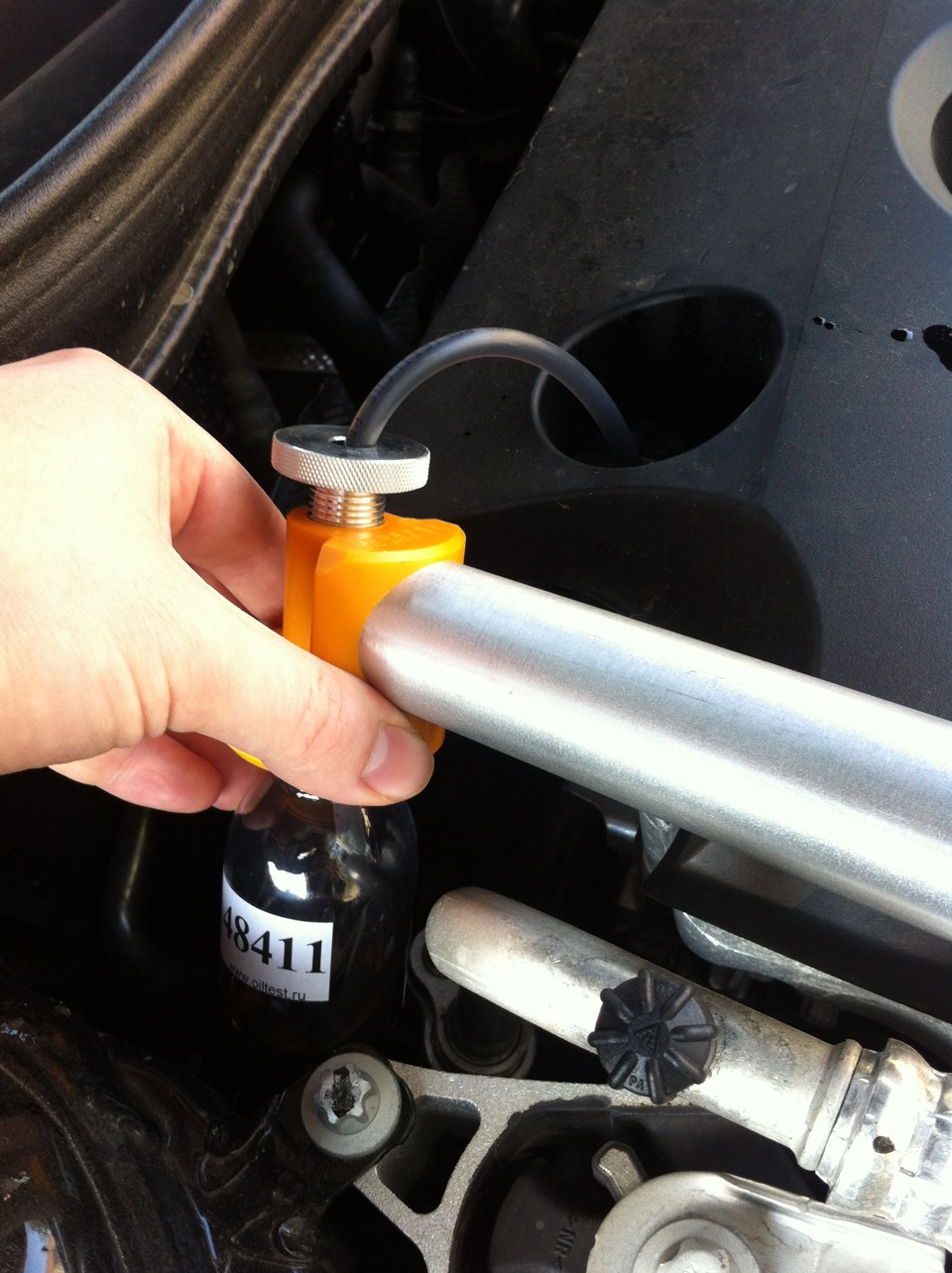 Сегодня прошел отметку в 5000 км и в связи этим, а также профессиональным интересом решил проверить в каком состоянии находится моторное масло и сам двигатель после обкатки. Ну и заодно посмотреть что из себя представляет оригинальное масло, какой там пакет моюще-диспергирующих присадок, сколько цинка и фосфора, есть ли бораты/молибден и т.д. Для этого взял насос для отбора проб, прикрутил емкость и опустил вместо щупа трубку. Откачал порядка 100 мл масла, завтра отправлю в МИЦ ГСМ, результаты получу через неделю, выложу с комментариями что и как с маслом.