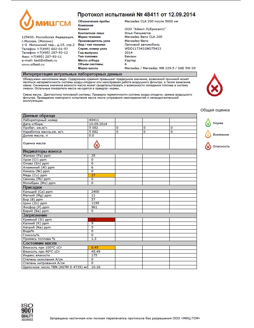1. Износ по железу составил 35 ppm. Много это или мало? Все относительно. Если говорить про критические величины, то до них еще есть запас- волноваться нужно с 90 ppm. НО! Для сравнения тест на моей предыдущей машине (KIA KOUP 2.0) показал износ по железу на 11 000 км пробега всего 14 ppm. Наверняка дело в притирке узлов в момент обкатки и поэтому износ довольно большой. Для справки: железо входит в состав блока цилиндров, головки блока цилиндров, клапанов, толкателей и направляющих клапанов, коленчатого, распределительного и коромыслового валов, поршневого пальца, масляного насоса. Что из них износилось- остается загадкой…