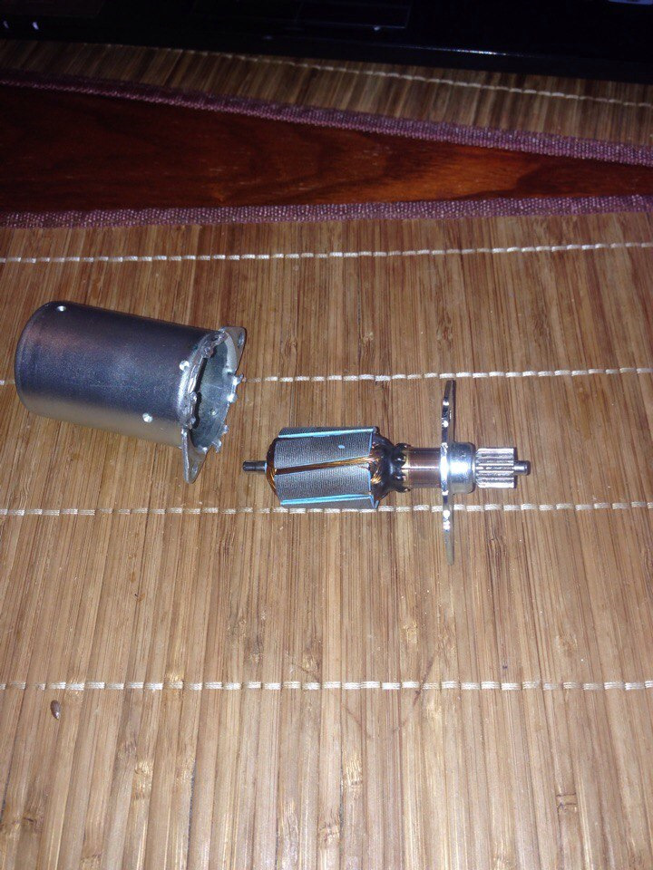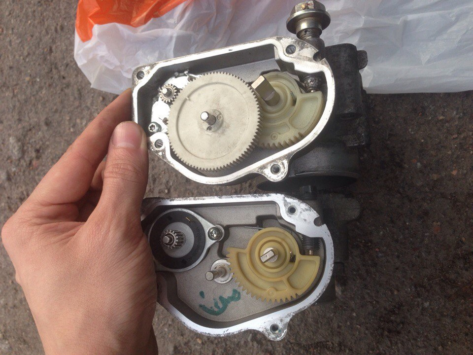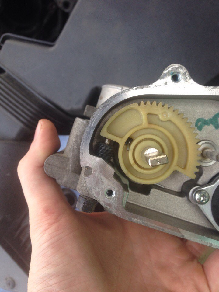 Начитавшись инфы начал грешить на датчик, у знакомого с такого же движка снял его и переставил, вообще 0 эмоций, решили перекинуть полностью дроссель, все заработало, возник сразу вопрос если не в датчике дело то в чем? Моторчик, правильно, достал посмотрел на него и вспомнил что когда брызгал вдхой на оси, попал и на него, ай яй яй, естественно он не герметичен, все щетки позаливало. Достал, усы которые держут моторчик смело можно отгибать, все-равно потом на винты все сядет и подожмется, прочистил, полирнул коллектор шкуркой 2000 одев его на дрель, щетки еще приличной длины, проблема кстати достать их, т.к. вставляются в пластиковую накладку, и приходится разделять ее на 2 половины но выбора не было, потом припаял провода, ну в итоге все собрал, проверил омы, дал напругу, все крутится, красота.