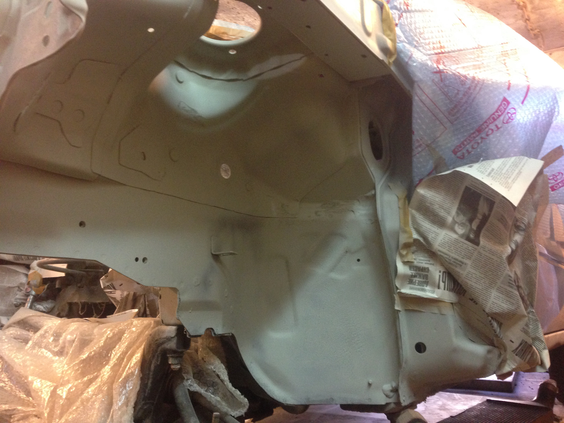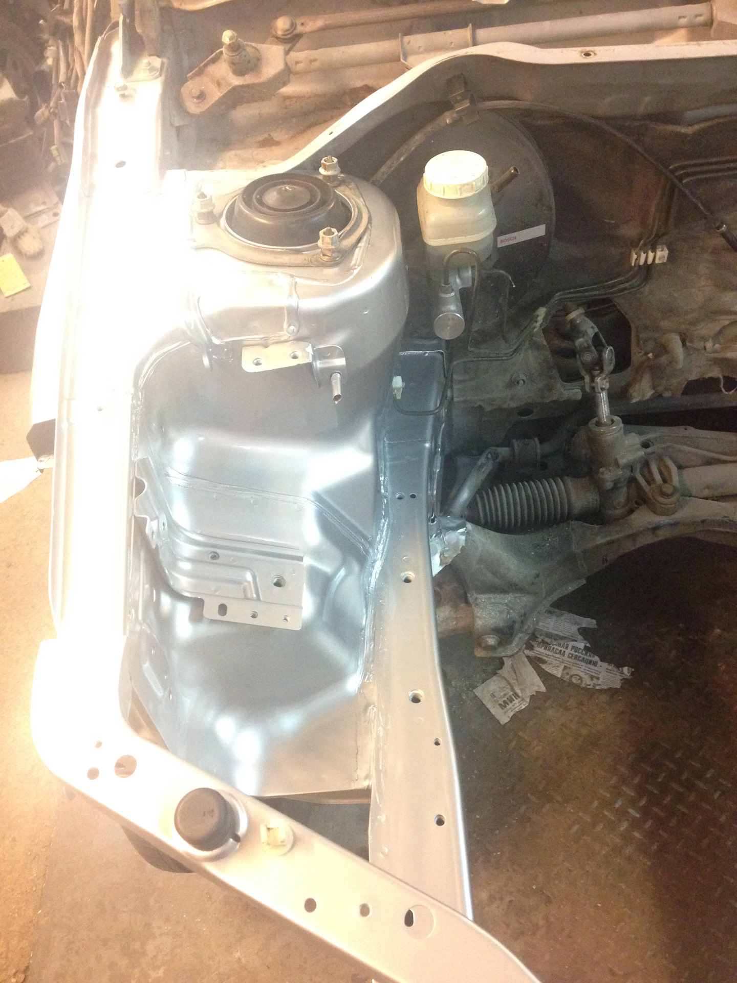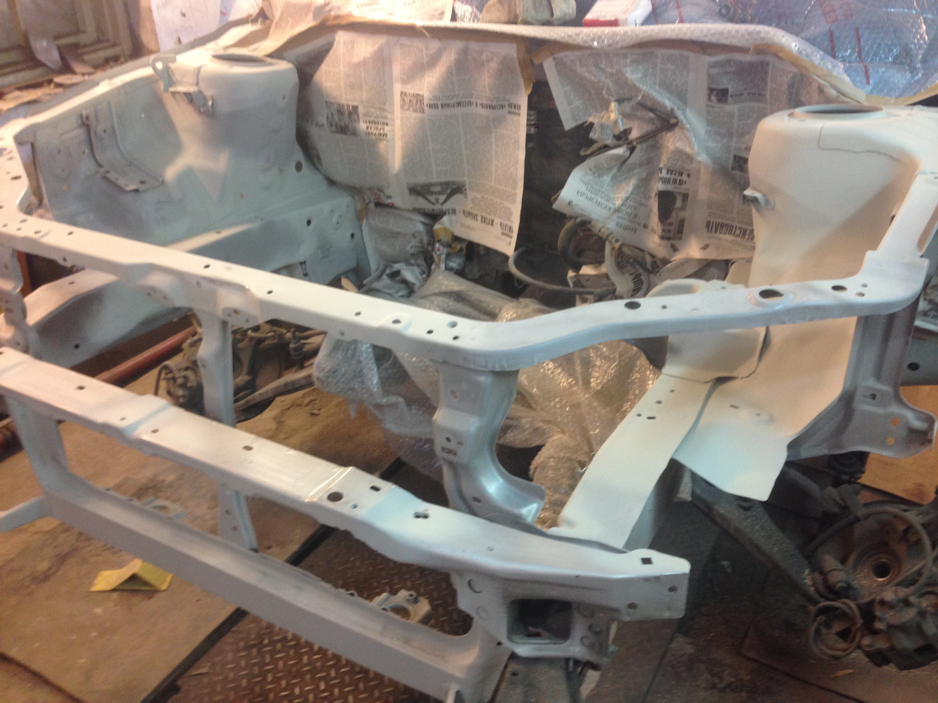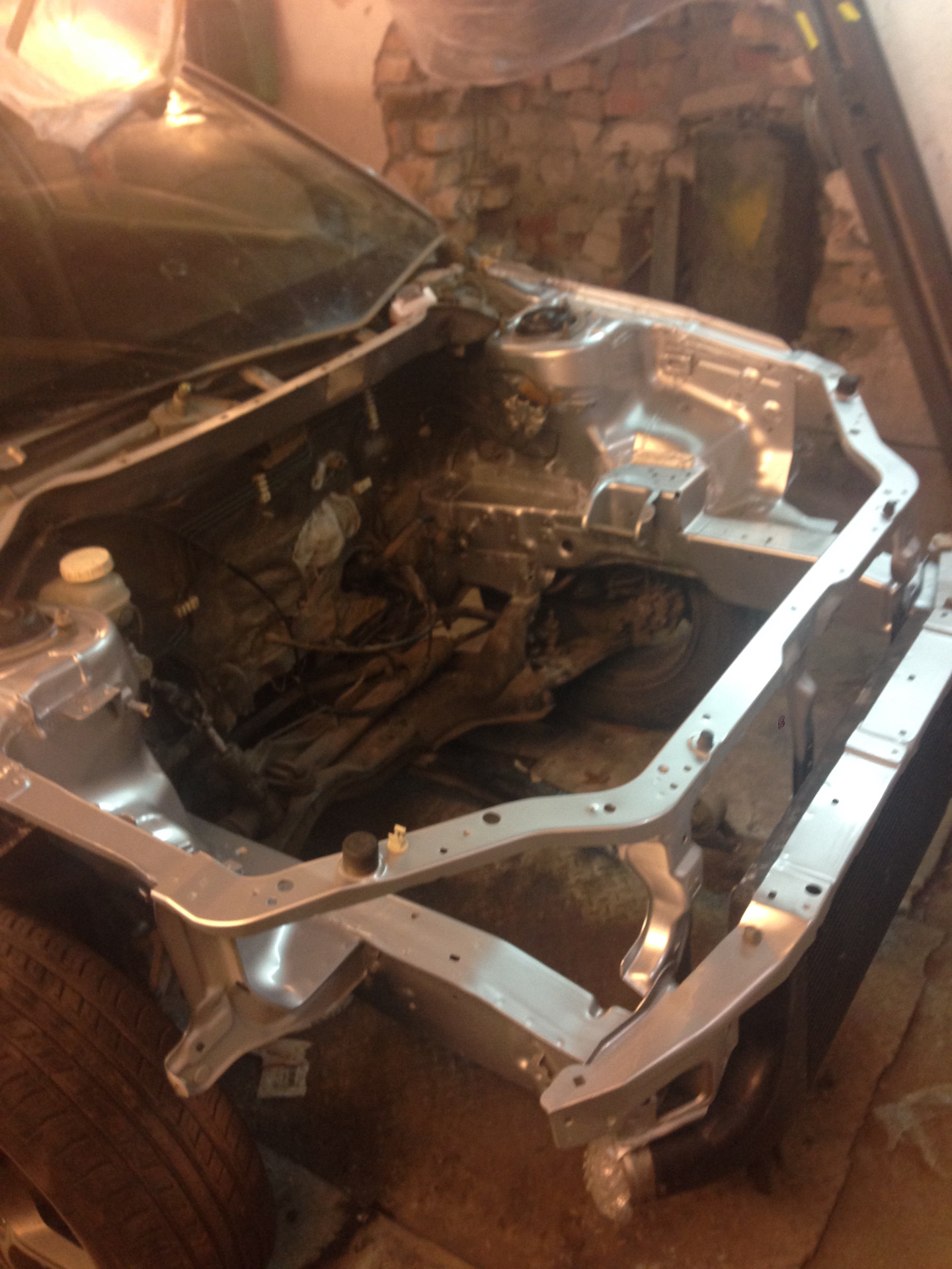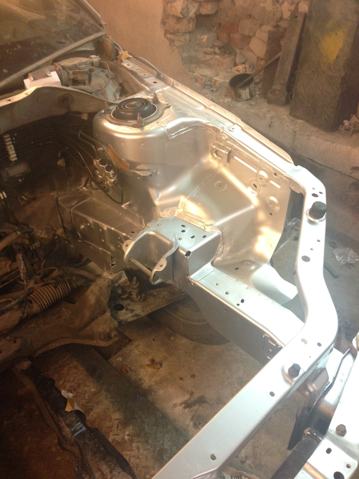 Итак, было доработано одно крепление, удалены лишние кронштейны в подкапотке, все имеющиеся очаги коррозии были безжалостно удалены, всё зачищено, загрунтовано и уже покрашено в серебро + сверху лак — морда цвета терминатора из жидкого металла). Выглядит так, что аж ставить теперь ничего не охота в подкапотку, но надо).