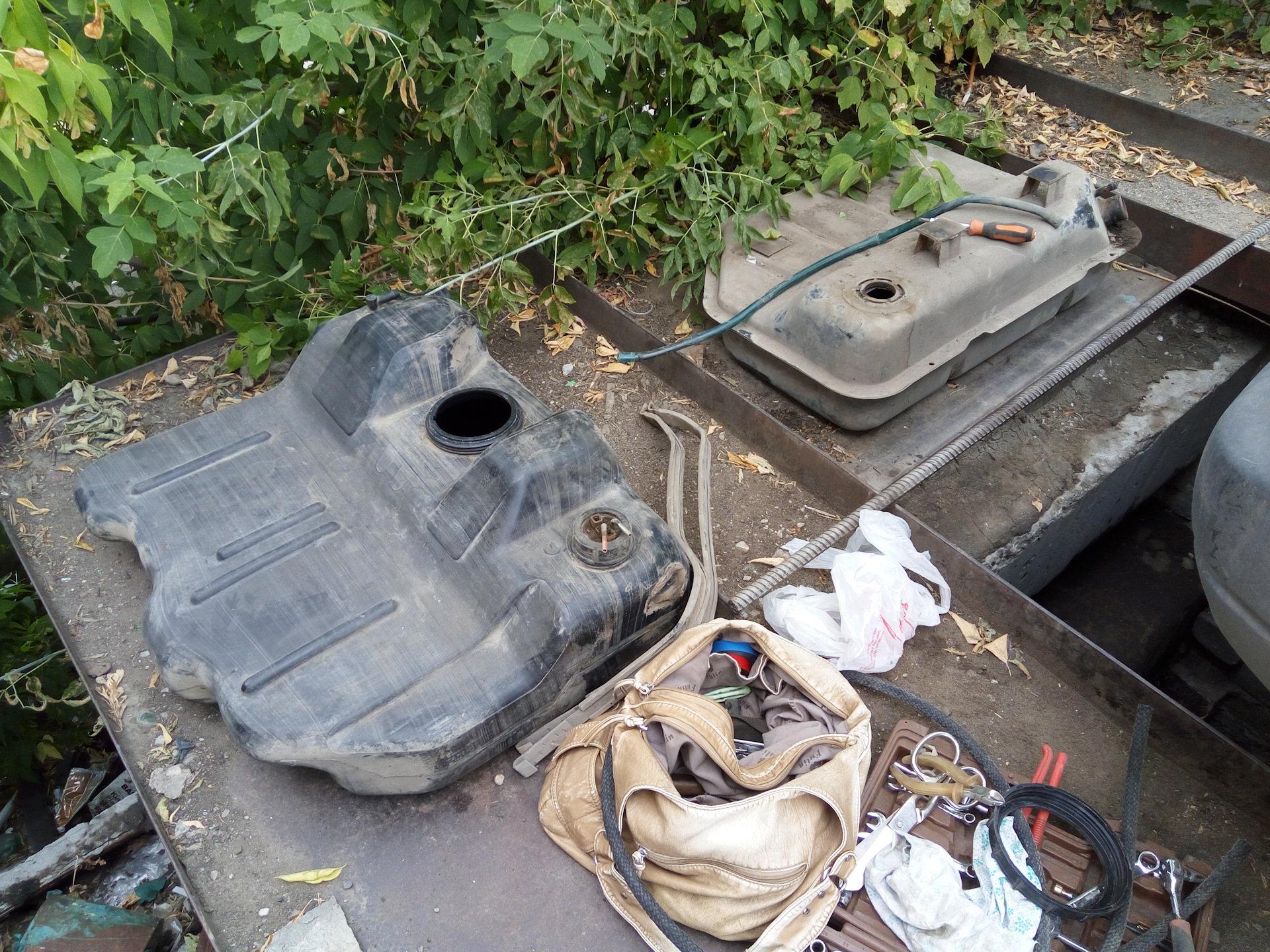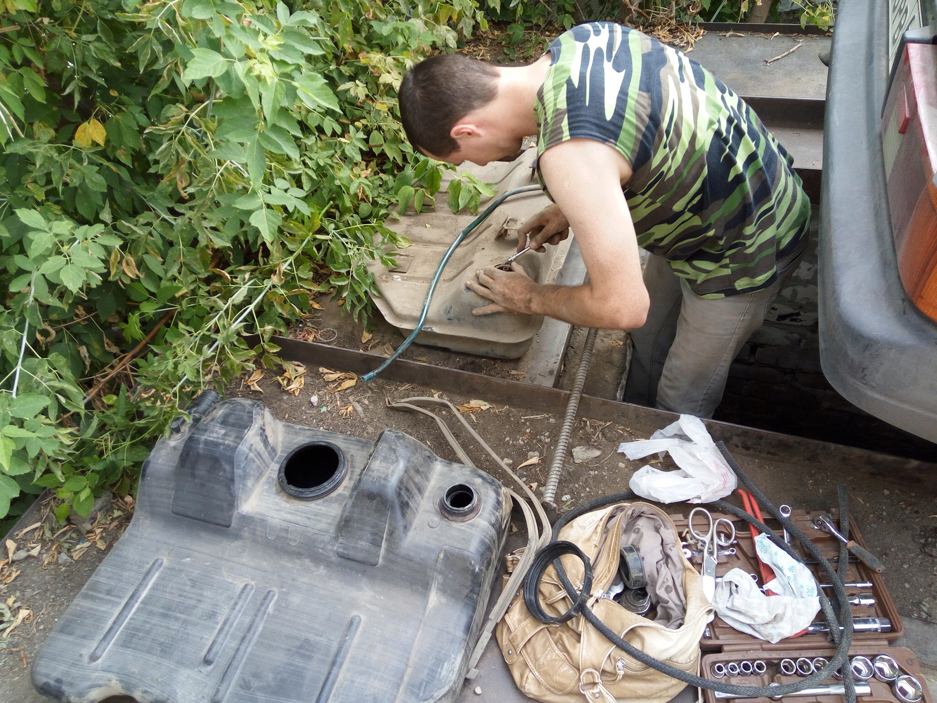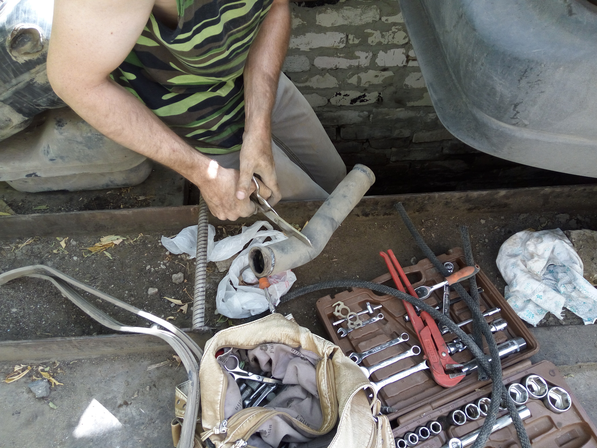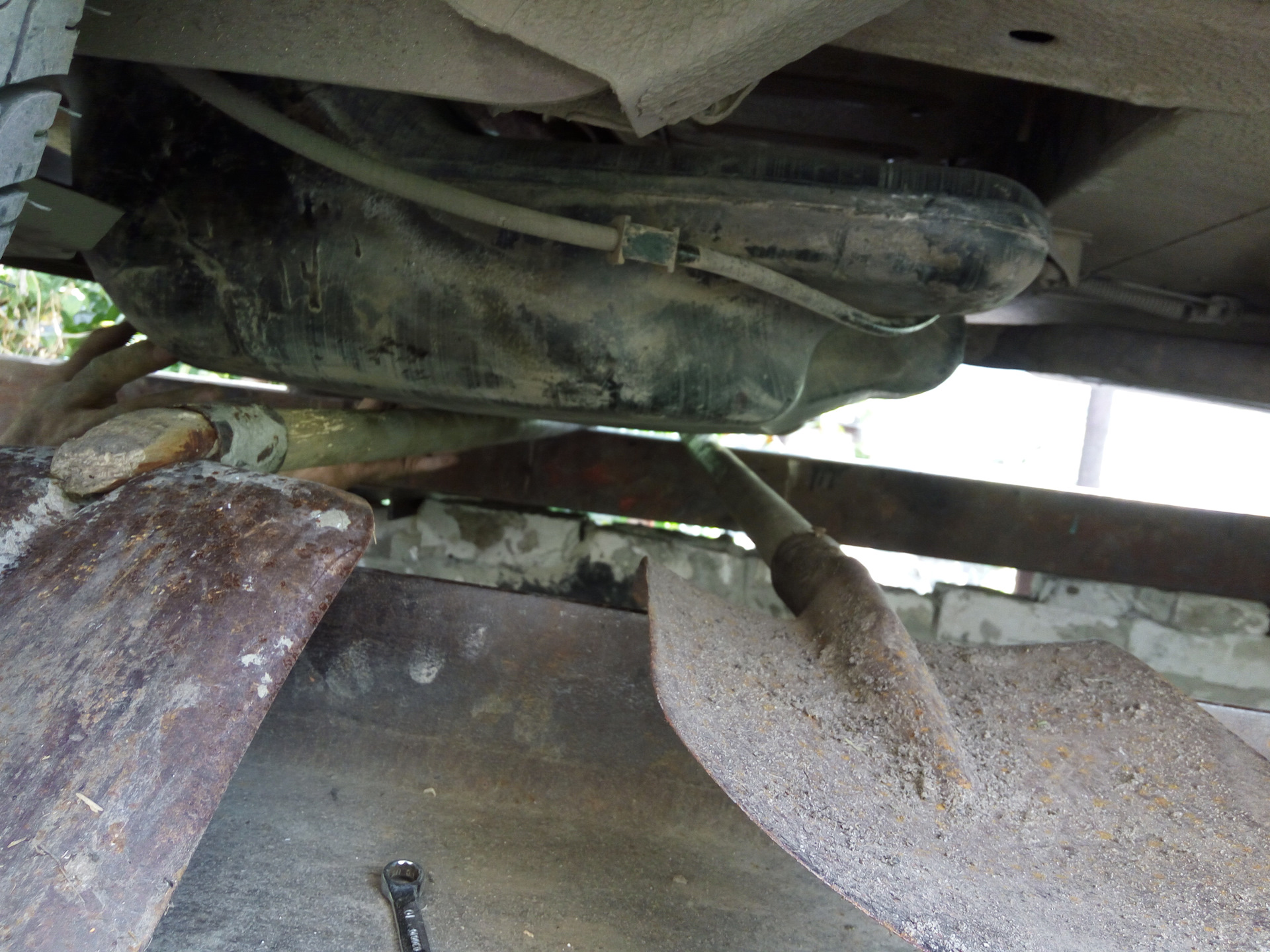 Сначала-то работа пошла быстро, хотя и не без мелких затруднений. Например все головки, выходящие за рамки набора, а это крупнокалиберные и удлиненные, я оставил в другом гараже, в отдельной сумке. А для того, чтобы открутить гайки подвесов бака, как раз нужна длинная головка на 14. Пришлось извращаться, откручивать потихоньку ключом, пока не появилась возможность обычной головкой зацепиться.